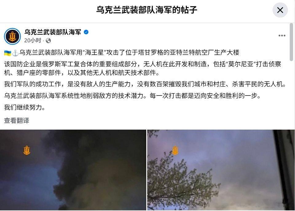 4月19日,乌海军发射海王星巡航导弹,对俄塔甘罗格市“亚特兰特航空”无人机工厂发动致命打击,引发猛烈爆炸,随后大火和黑烟在厂区升起,与之相邻的别廖夫航空综合体和附近的塔甘罗格机械学院同时也遭导弹袭击,部分建筑在袭击中受损。今年1月和3月乌导弹和无人机先后袭击过该厂。“海王星”导弹是乌海军自主研发的岸基反舰巡航导弹,改装后可执行对地攻击任务,具备抗电子干扰能力,曾参与击沉俄“莫斯科”号军舰等行动。见于无人机在战场中的重要性,乌在对俄本土的袭击中,重点将无人机制造厂、零部件制造厂和仓库作为打击目标,削弱俄在交战前线的无人机作战能力和袭击乌民用基础设施能力。