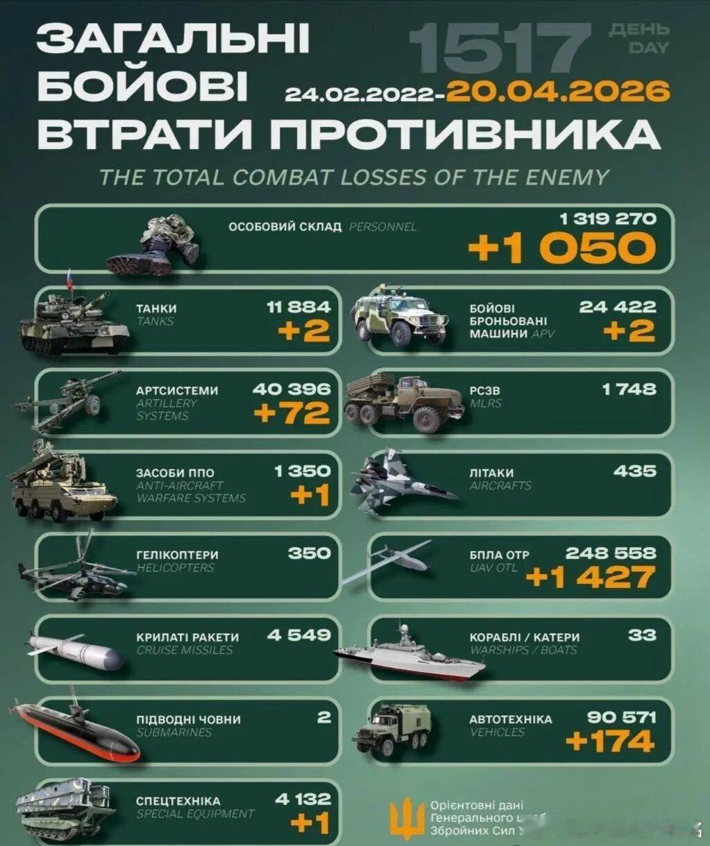 乌俄战争进入第1517天,乌克兰总参谋部发布战报:过去24小时俄军发动进攻85次,其中12次在胡利亚伊波列(9次在苏梅)、22次在康斯坦丁诺夫卡、7次在利曼、28次在波克罗夫斯克、7次在南顿涅茨克区域。毙伤俄1050名。俄军累计损失1319270人。摧毁俄2辆坦克、2辆装甲车、72门火炮、1套防空系统、1427架大型无人机、174辆军车、1件特种设备。