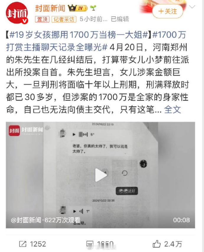 19岁女孩挪用父亲公司1700万打赏主播、当榜一大姐,导致公司破产,对外还欠下数百万借款,可女儿依旧整日沉迷手机。父亲主动联系接受打赏的主播,要求退还钱款,但均遭到对方拒绝,几经纠结后,打算带女儿投案自首…生这样的女儿,真的不如生一只叉烧包。还轻信富养女儿谬论的人,赶快醒来…