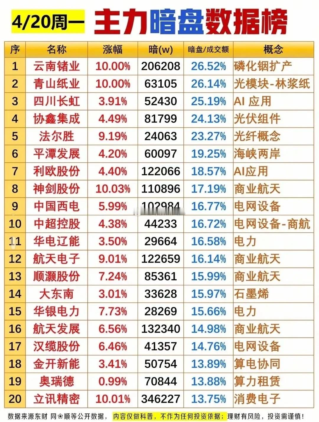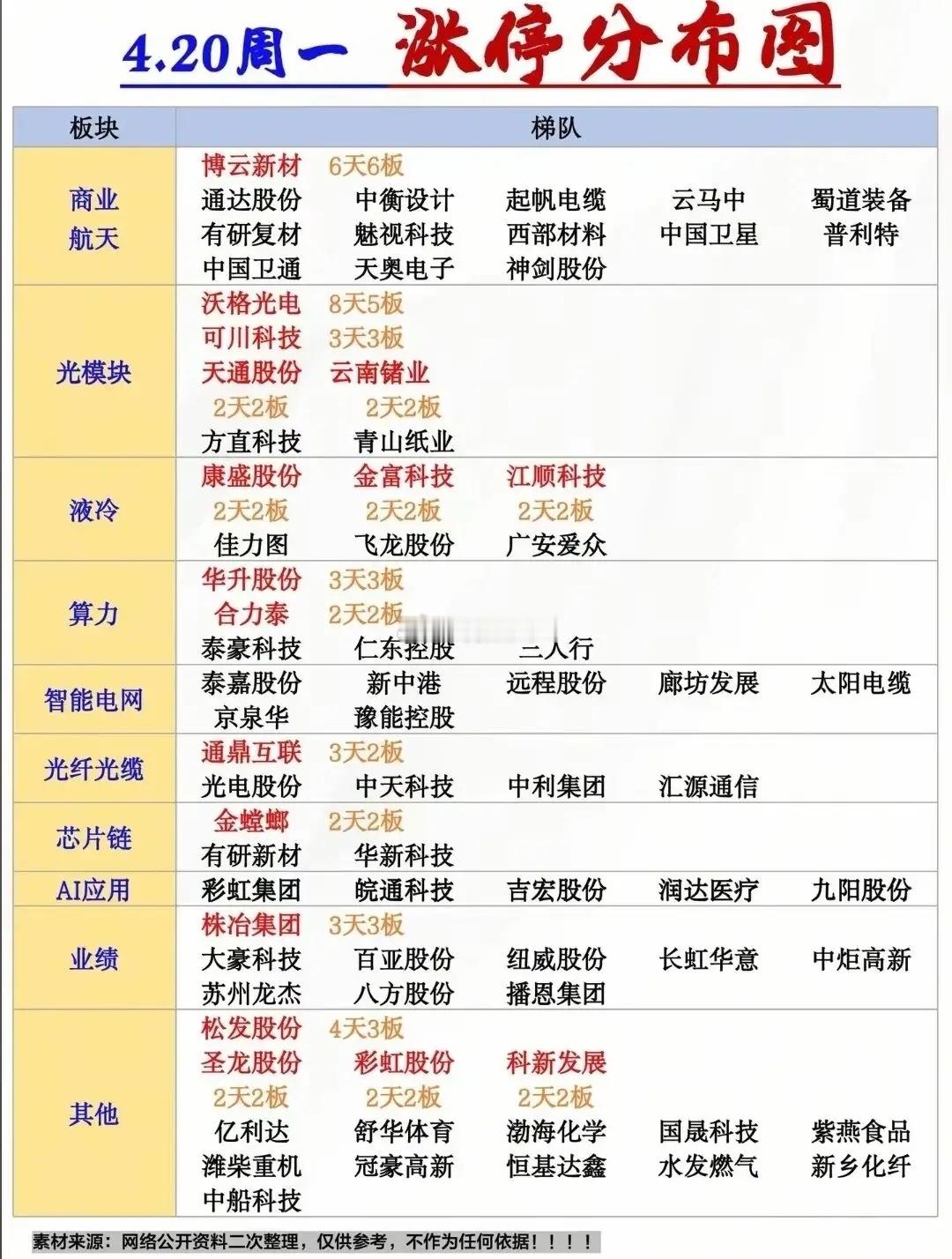 4.20周一复盘|航天军工与光模块双轮驱动,市场情绪回暖。今日A股放量上攻,三大指数齐齐收红,两市超3400家个股上涨,赚钱效应十分显著。主线方面,商业航天与光模块板块成为市场焦点,6连板的博云新材扛起龙头大旗,立讯精密、中国卫星等核心标的获主力资金大力加持,液冷、算力等分支也同步走强。
