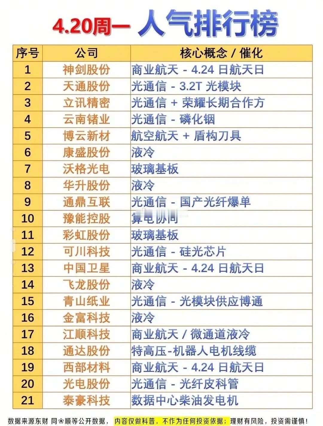 游资与机构动作频繁,葛卫东豪掷近8亿加仓立讯精密,章盟主、北京春路等大佬活跃于沃格光电、神剑股份等热门标的,市场资金聚焦度极高。整体而言,在航天日催化与AI算力链共振之下,市场主线清晰,资金抱团效应显著,后续可重点关注龙头分歧机会与板块轮动节奏。(注:以上内容仅为市场复盘分享,不构成任何投资建议)