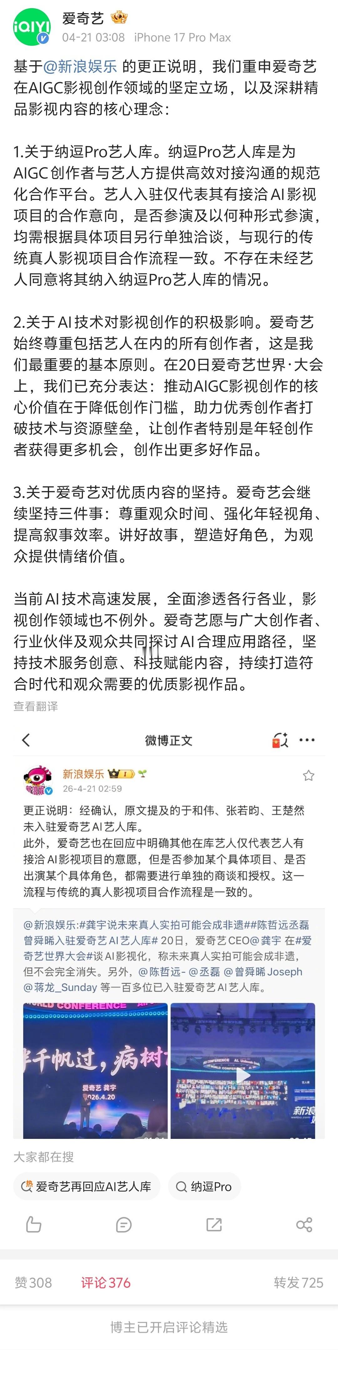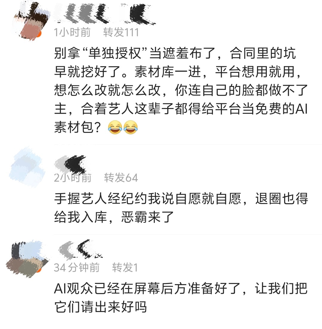 【爱奇艺已开启评论精选】爱奇艺再回应AI艺人库 从昨天到今天,爱奇艺AI艺人库引发网友热烈讨论。4月21日凌晨,爱奇艺再次发文称,艺人入驻仅代表其有接洽 AI 影视项目的合作意向,均需根据具体项目另行单独洽谈。但许多网友并不买账。目前,这条微博已经开启评论精选。大家都在转发区纷纷表示:“别拿‘单独授权’当遮羞布了。”“AI观众已经在屏幕后方准备好了,让我们把它们请出来好吗?”“Al剧让Al观众看,让Al观众自己续会员。”“嫌自己股价高了可以直说。”
