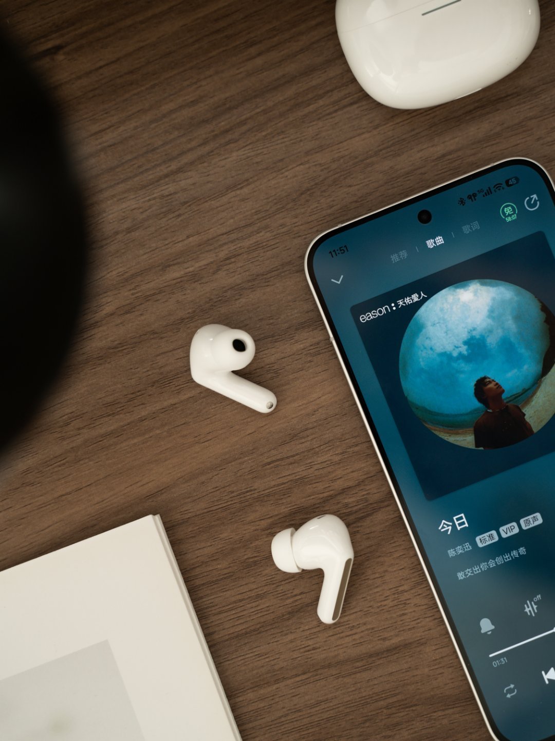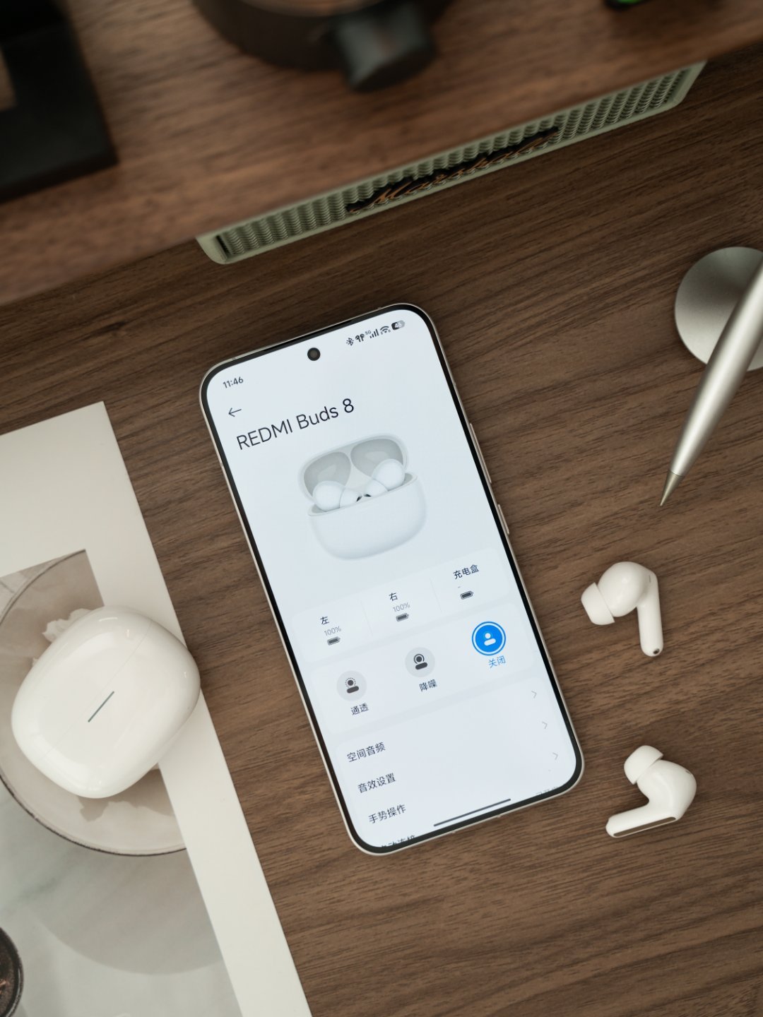 11mm的动圈单元,整体声音比较饱满,人声很细腻,也支持个性化调音设置。不过我感觉默认的效果也很耐听了。主流的高清编码+Hi-Res小金标认证,该有的都有。50dB/4kHz的宽频主动降噪,日常办公室场景戴上基本就“两耳不闻窗外事”了。空间音频、双设备连接、查找等也都有。续航单次能达到11小时,结合电池仓达到44小时,支持快充。
