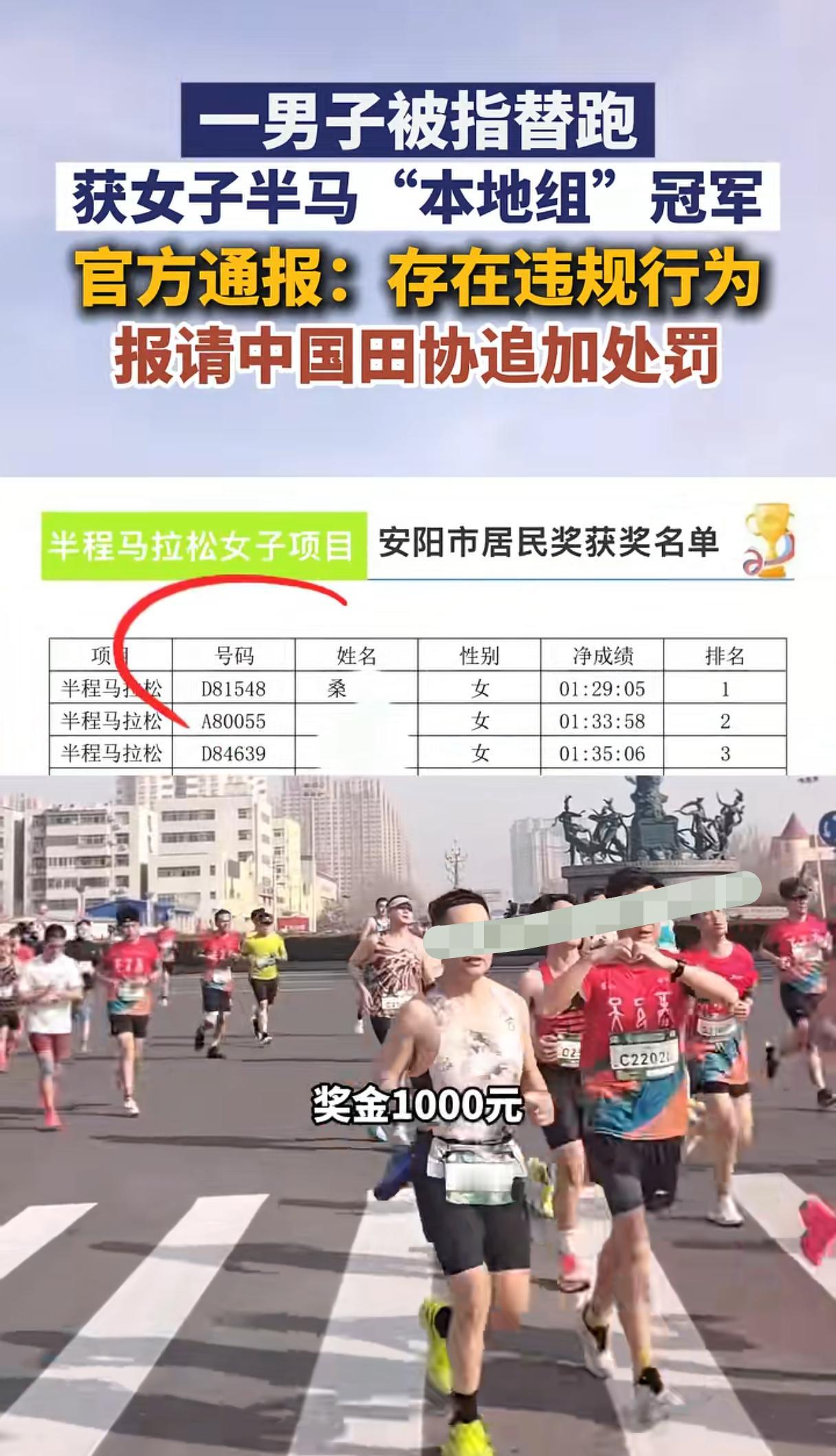 滑天下之大稽! 男子戴女号跑女子半马夺冠, 奖金才1000块,被终身禁赛 离谱他