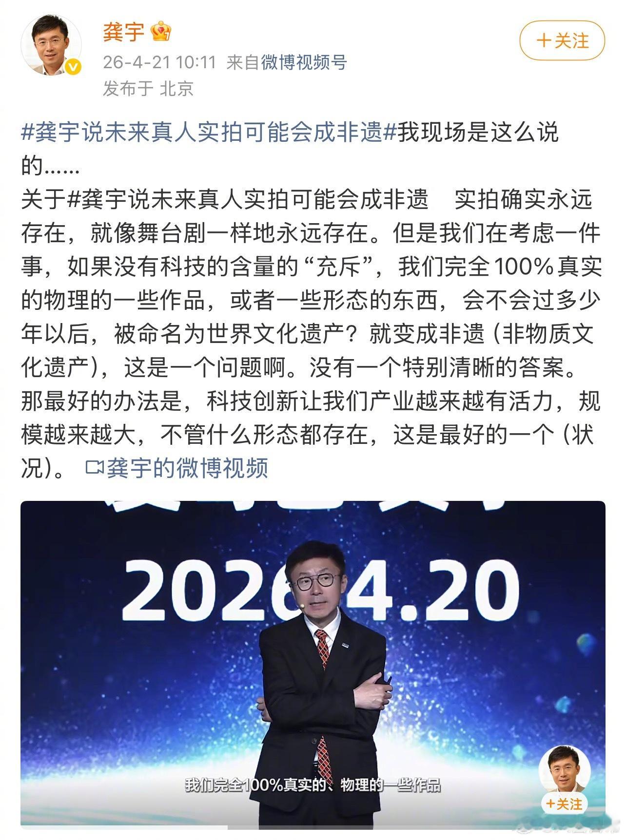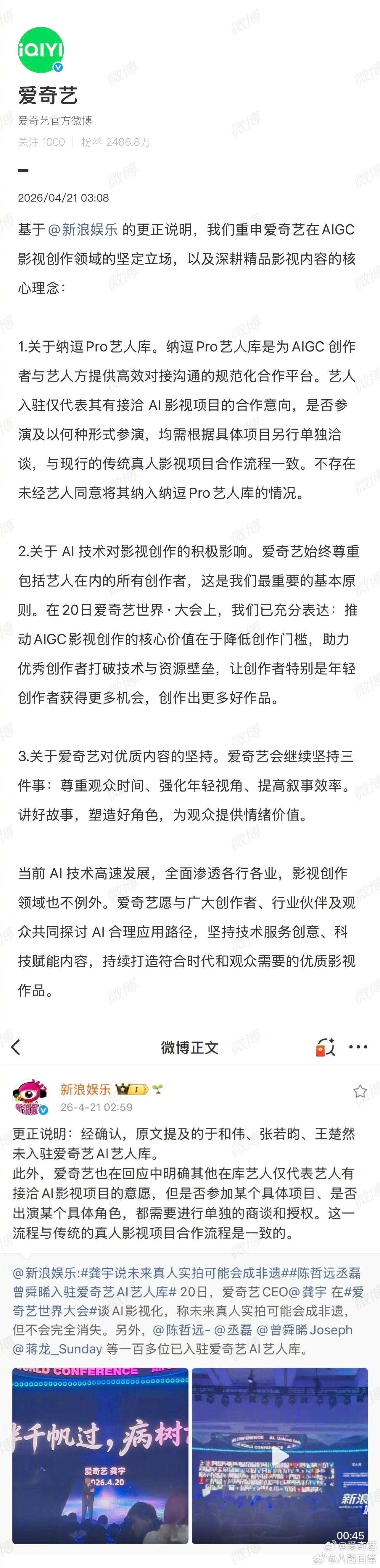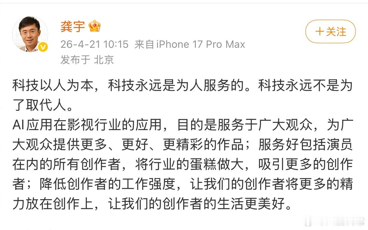爱奇艺CEO龚宇连发三条微博解释,表示AI在影视行业的应用,目的是服务于广大观众,为广大观众提供更好的作品,也服务好包括演员在内的所有创作者