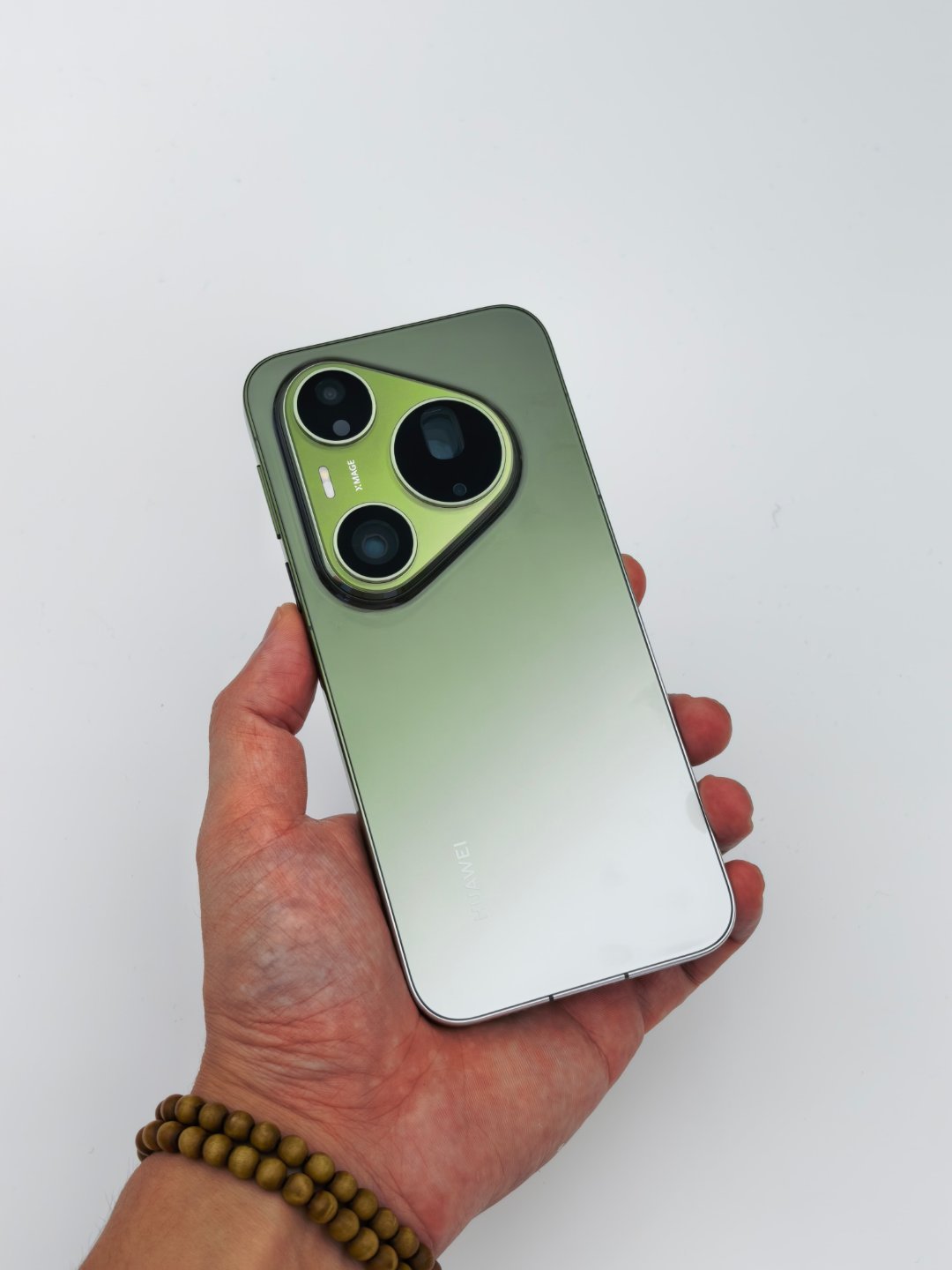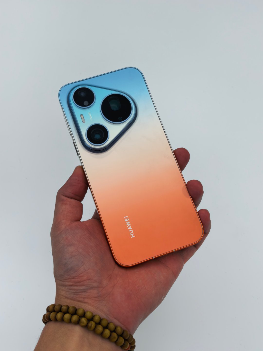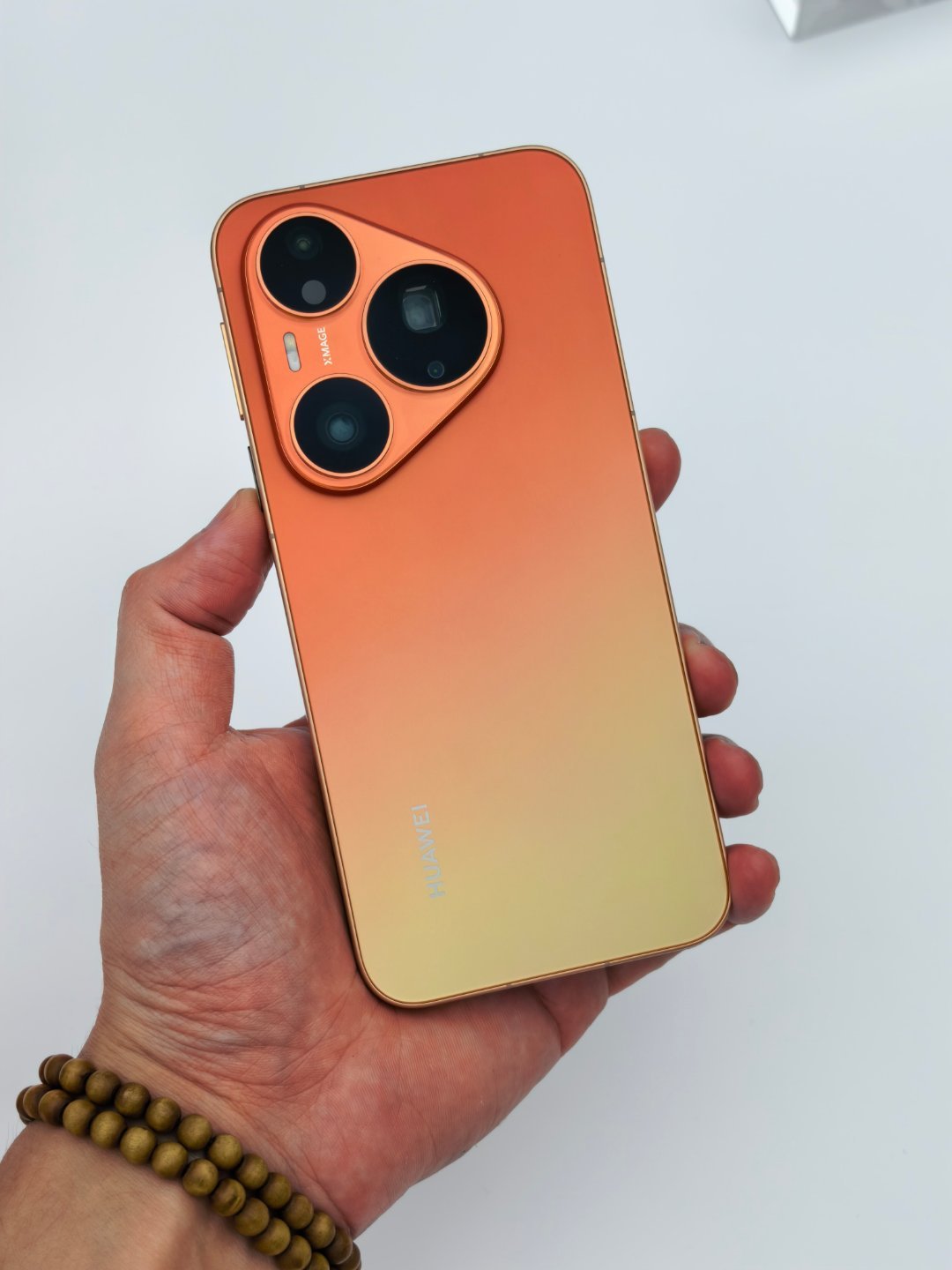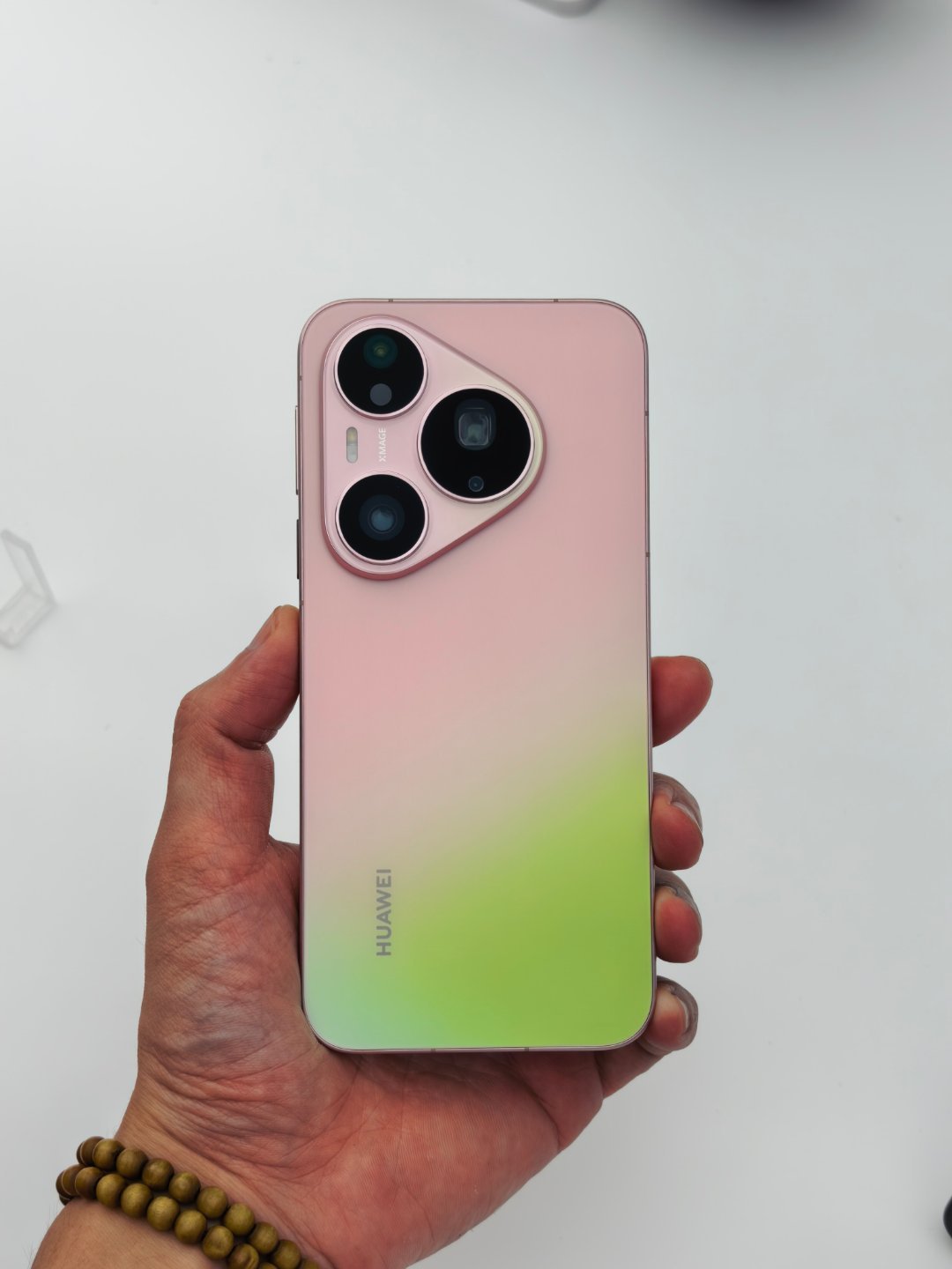 昨天在展区也拍了一下Pura 90系列的三款。Pro和Pro Max主打渐变色,连白色也是有点渐变效果的。这个颜色效果确实很亮眼,中框也是渐变色。除了橘子海和橘子汽水的比较鲜艳,绿色这个真机也是比图片舒服,非常棒。数字版是纯色加线条纹理,轻薄,后置是倒三角的,这个设计是不是很另类有点东西