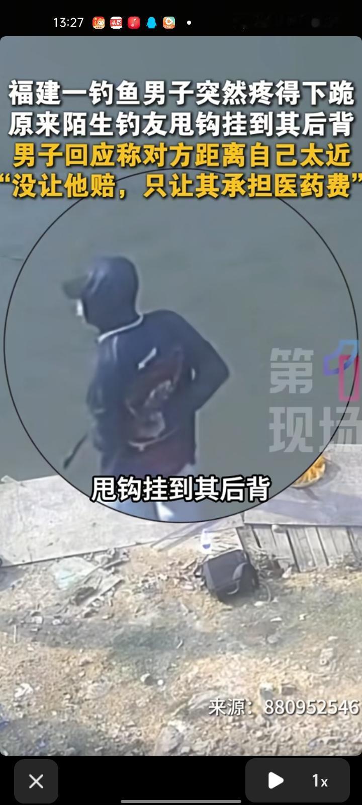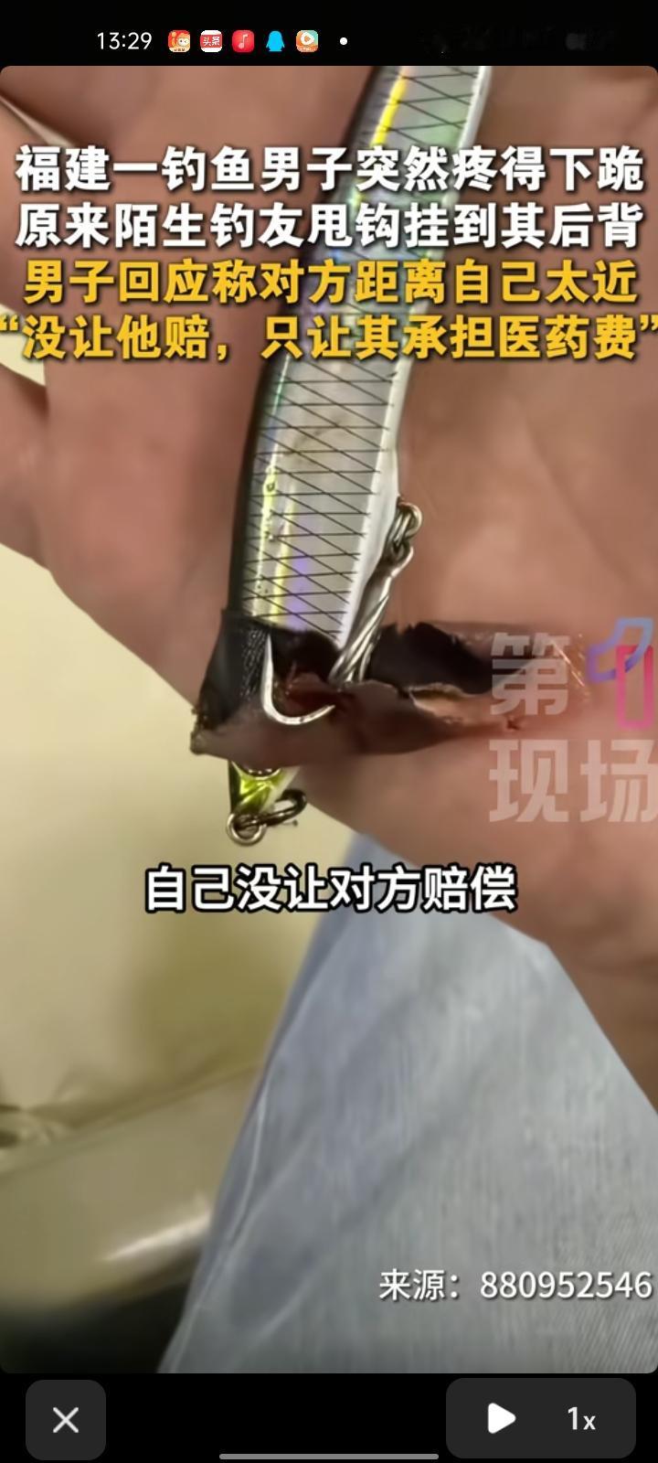 当事人董先生表示,对方和自己的距离太近,一下甩到自己背上,自己疼得下跪,气都没上来,后面去医院打麻药把钩子取出来了。没让对方赔偿,只让其承担医药费