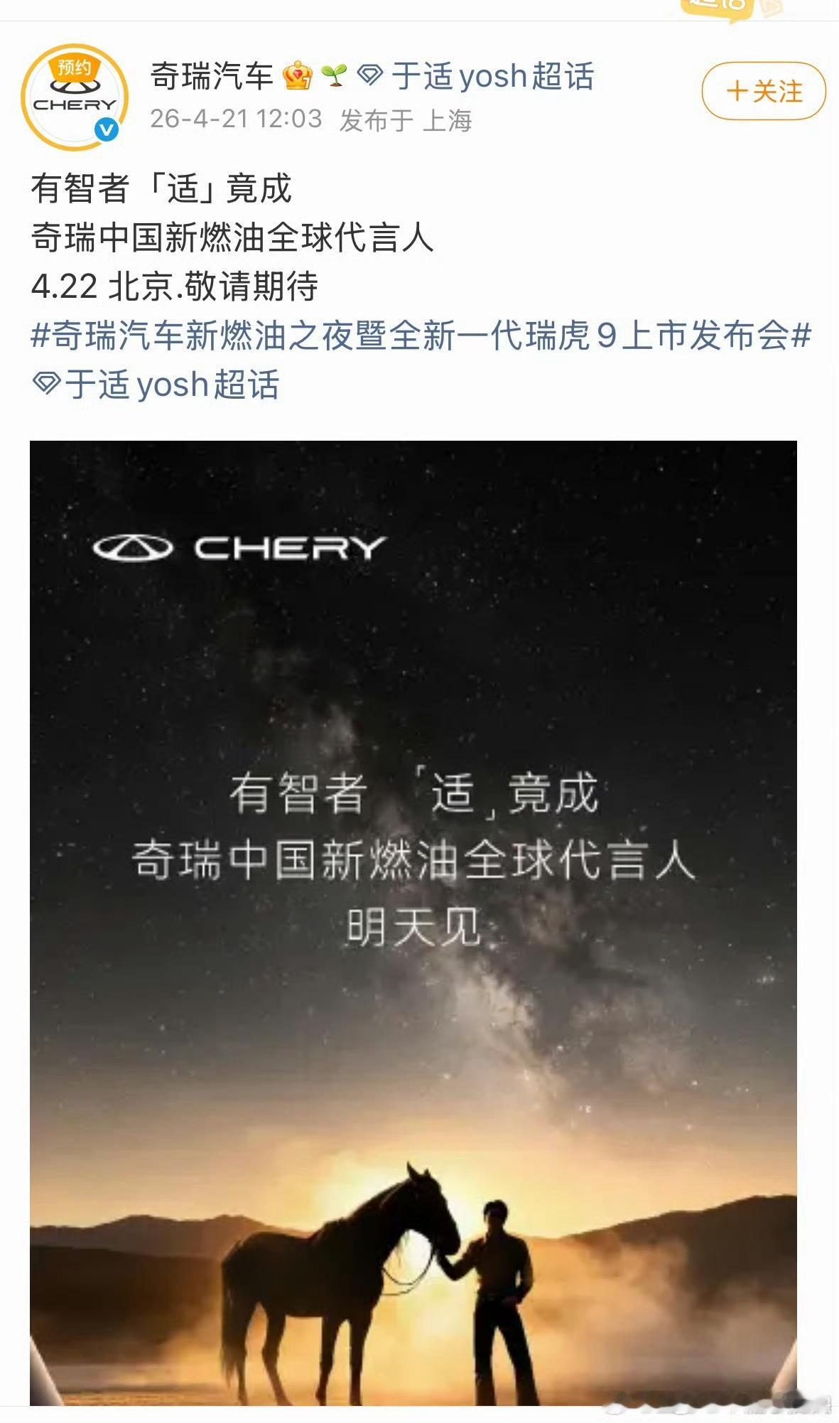 于适车代也要来了!22号将官宣奇瑞中国新燃油全球代言人👏