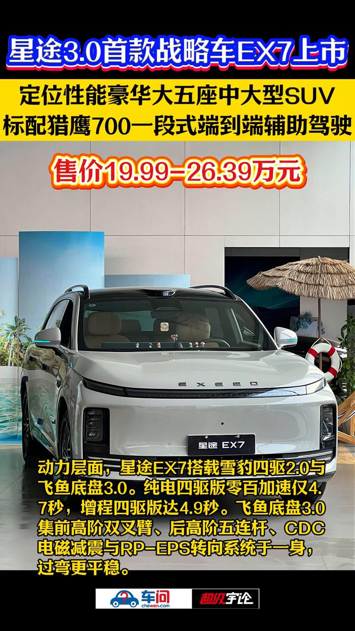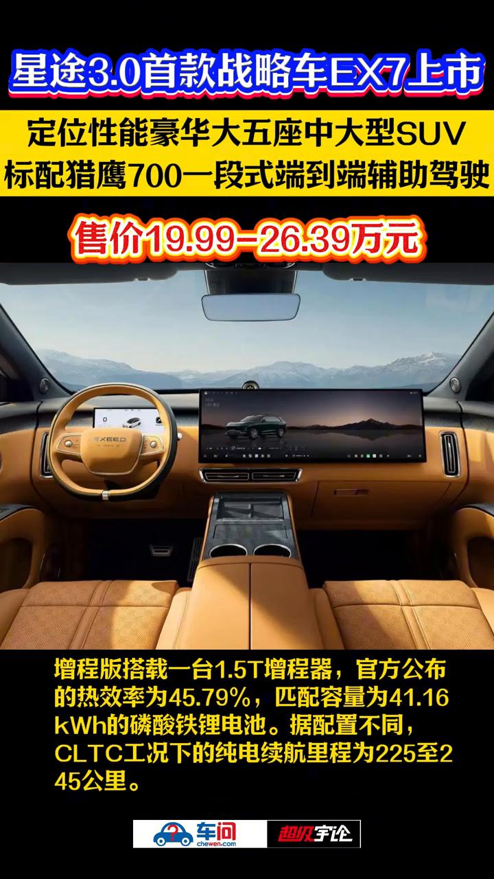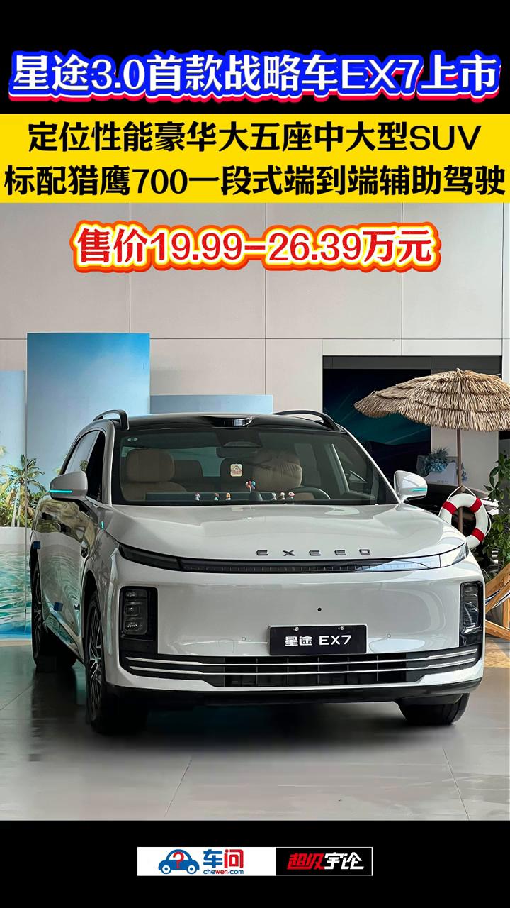 星途3.0首款战略车EX7上市,定位性能豪华大五座中大型SUV,标配猎鹰700一段式端到端辅助驾驶,售价19.99-26.39万元。
