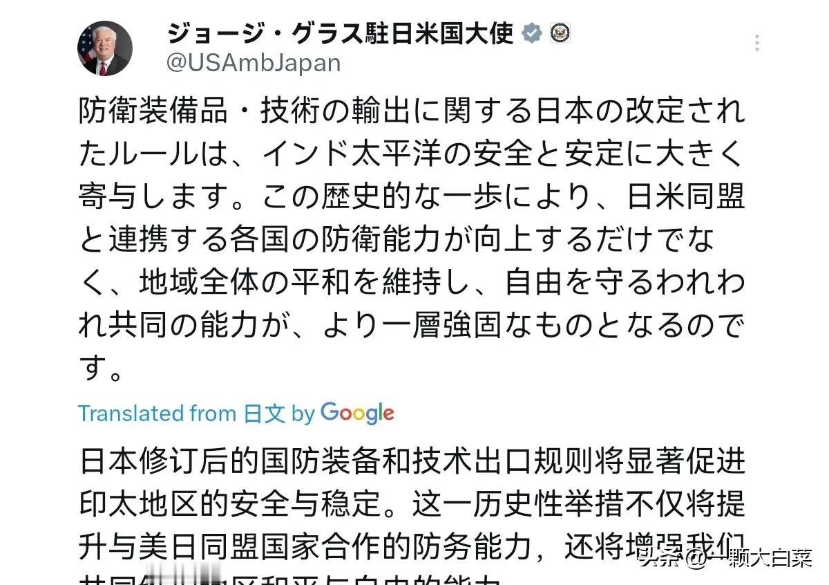 非常危险的信号!美国第一时间表态支持!在日本修改防卫装备与技术出口相关规则之后,美国出来回应了!4月21日,美国驻日大使表示,日本修订后的防卫装备与技术出口相关规则,将为印太地区的安全与稳定作出重大贡献。通过这一历史性举措,不仅与日美同盟协作的各国防卫能力将得到提升,我们维护地区和平、守护自由的共同能力也将进一步得到巩固。