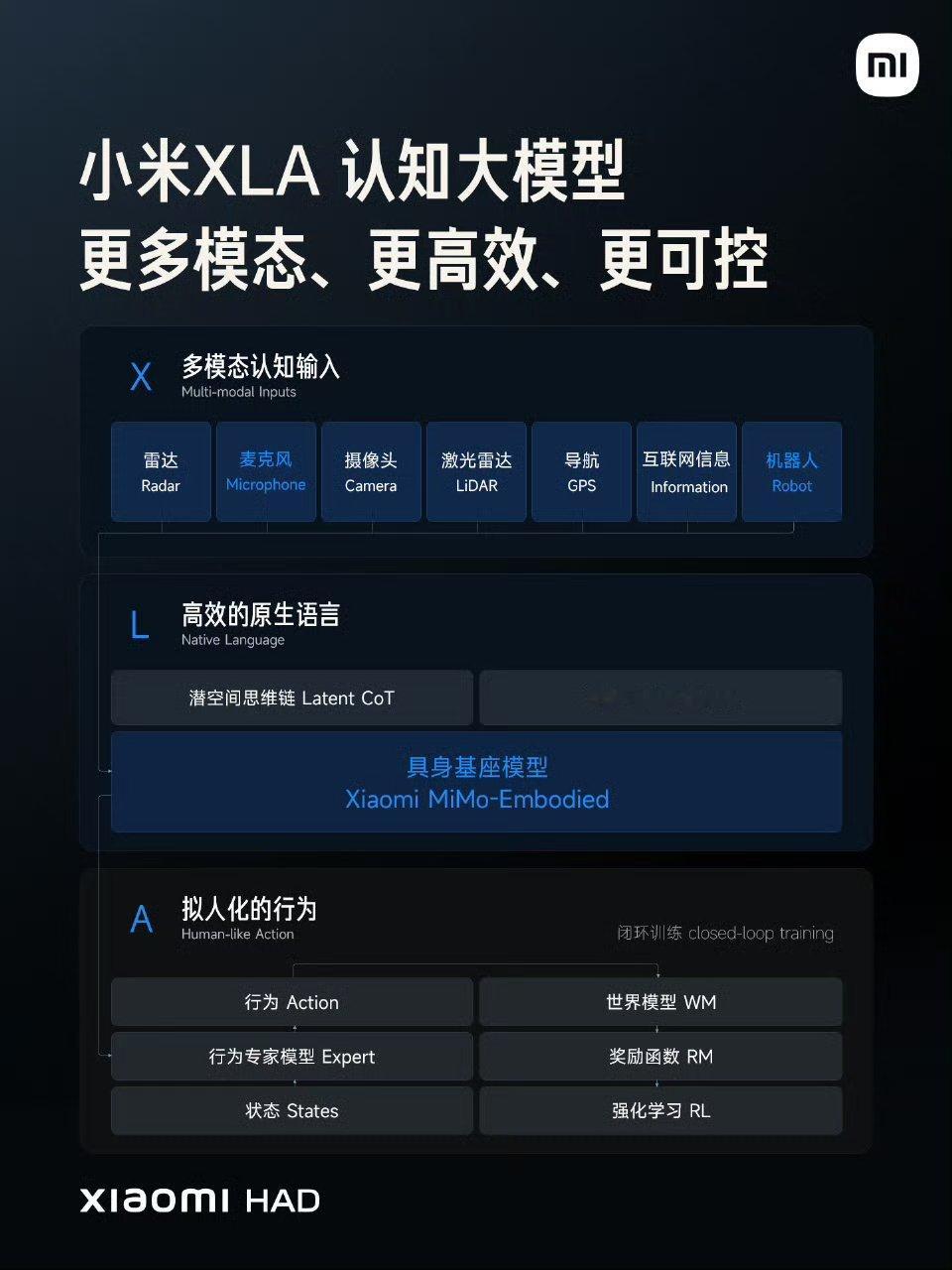 小米HAD辅助驾驶全新升级XLA认知大模型,并在新一代小米SU7全系交付即搭载,首次打通了“辅助驾驶”和“具身机器人”两大任务,引入多模态输入,融入了小米自研的 MiMo-Embodied 具身基座模型,能更好的学习、理解复杂场景。