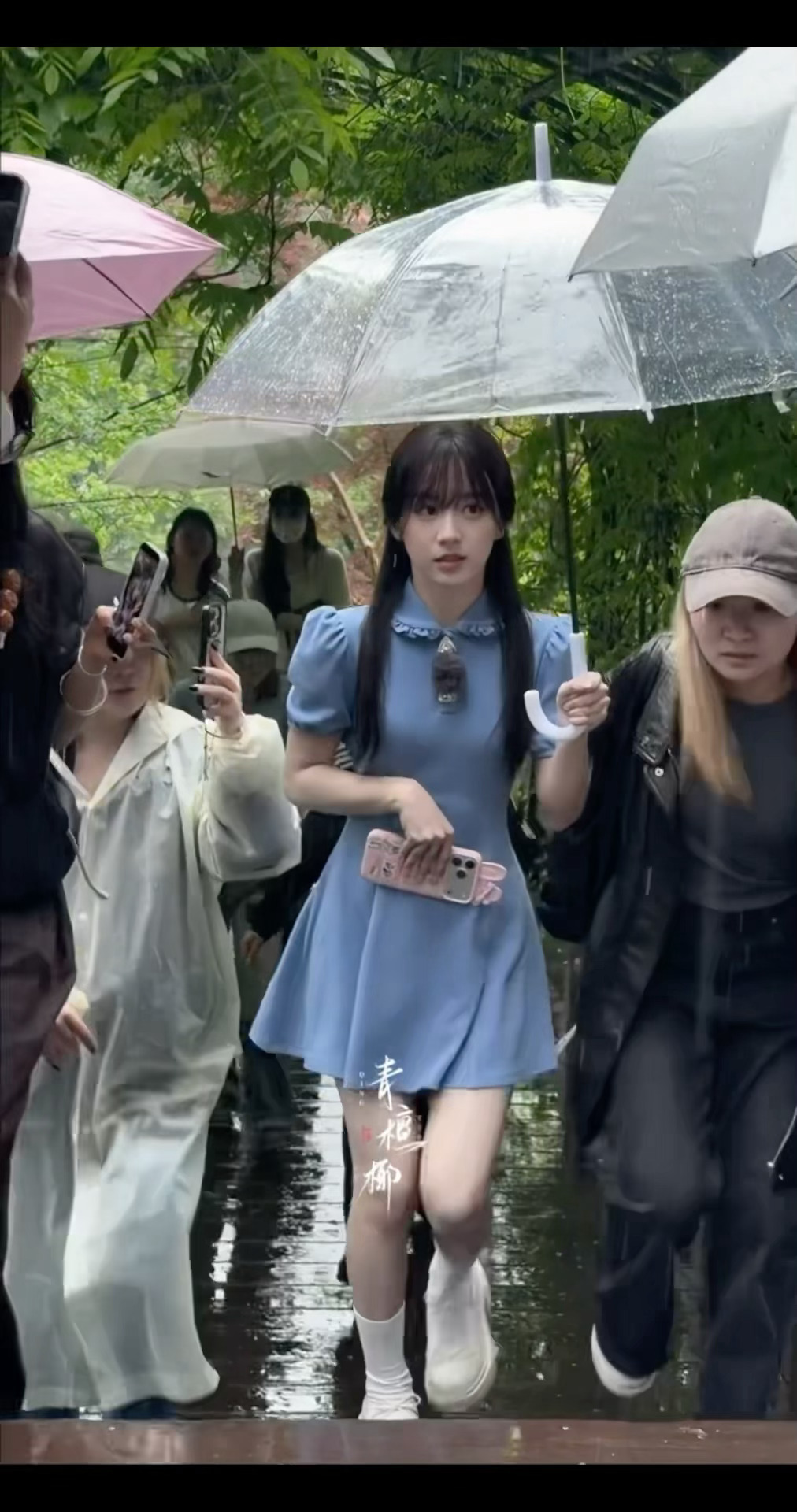 绿林、下雨、撑伞、发丝挂在耳朵旁……