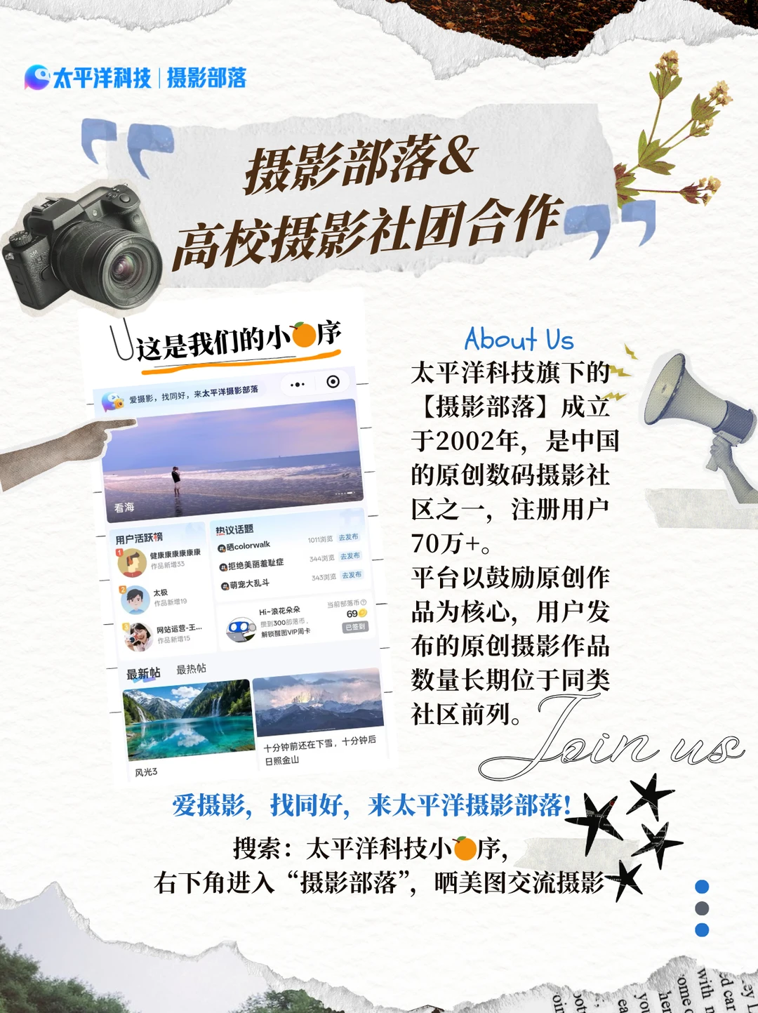 太平洋科技旗下【摄影部落】现面向全国高校摄影社团组织📸招募合作伙伴🤝,提供💰🎁多种支持!
