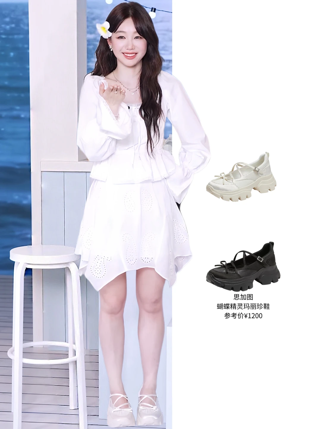 还有一套白色方领小衫与法式半身裙搭配蝴蝶精灵玛丽珍,甜美灵动!