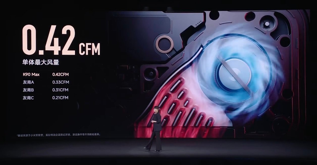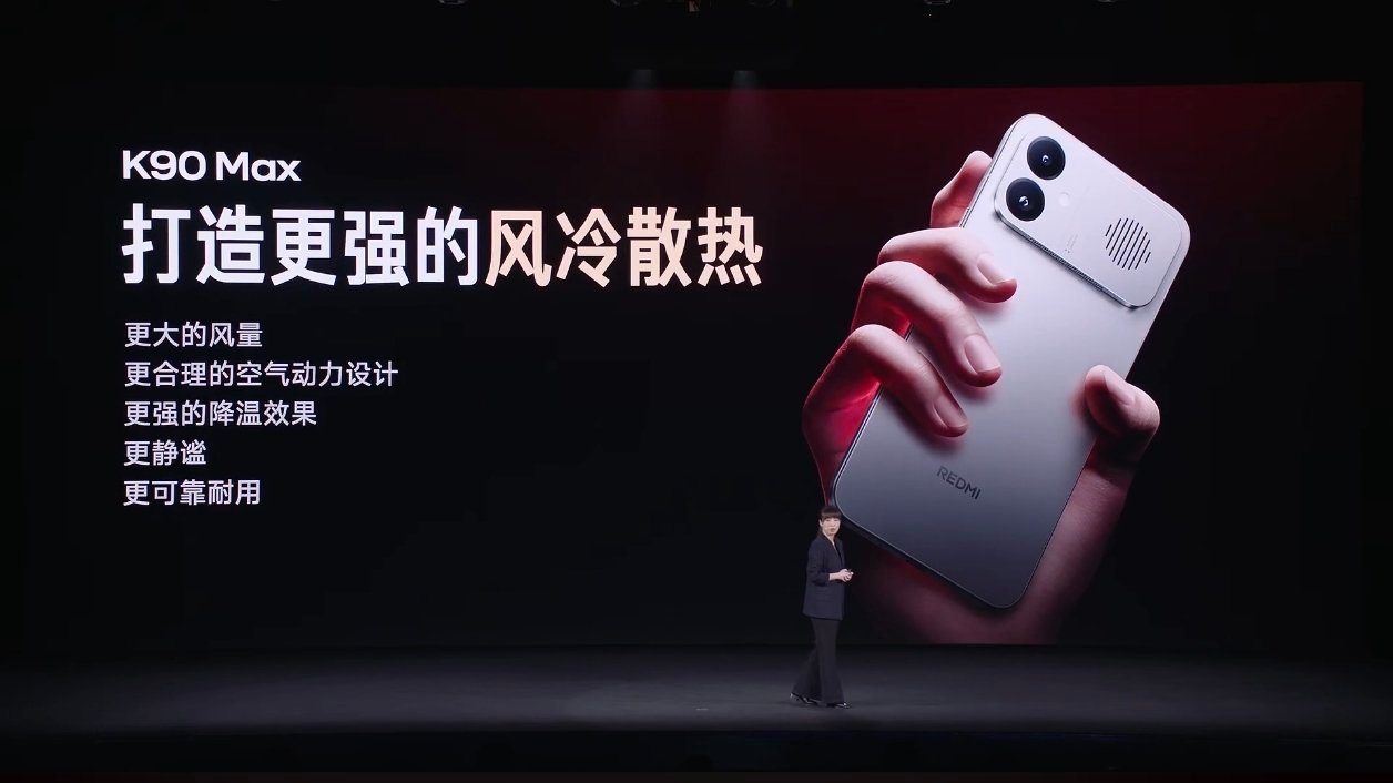 REDMI K90 Max也正在登场。米系的首款带主动散热风扇的机型。最近带风扇的机型确实更多了起来。REDMI的目标是一出手,要做行业最强。在性能核心上面,天玑9500处理器,AI独显D2,LPDDR5X Ultra+UFS 4.1,跑分干到了416万+,天玑平台目前最高的位置。风扇体积也是很大,直立式进风,前倾扇叶风,让进风量更大,散热效果更好。风扇机型,一个个都更卷起来了。只能说,游戏党狂喜!新机来了