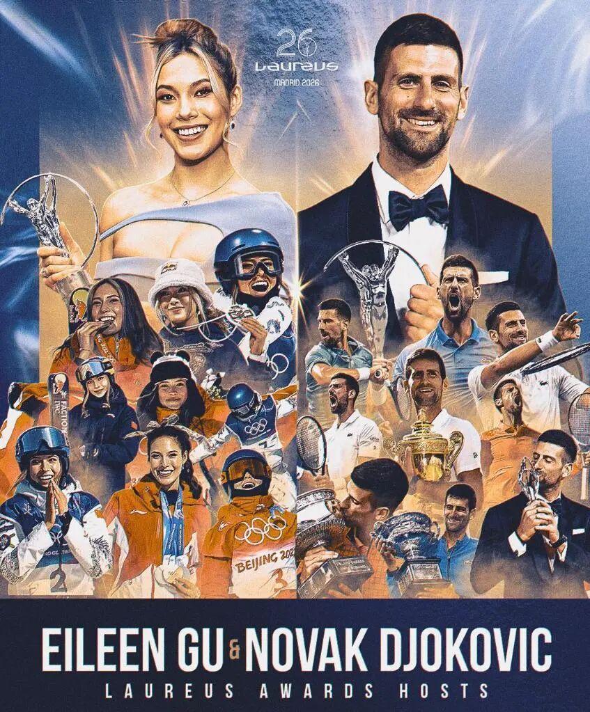 北京时间2026年4月20日,劳伦斯颁奖典礼,德约科维奇与谷爱凌联手主持。