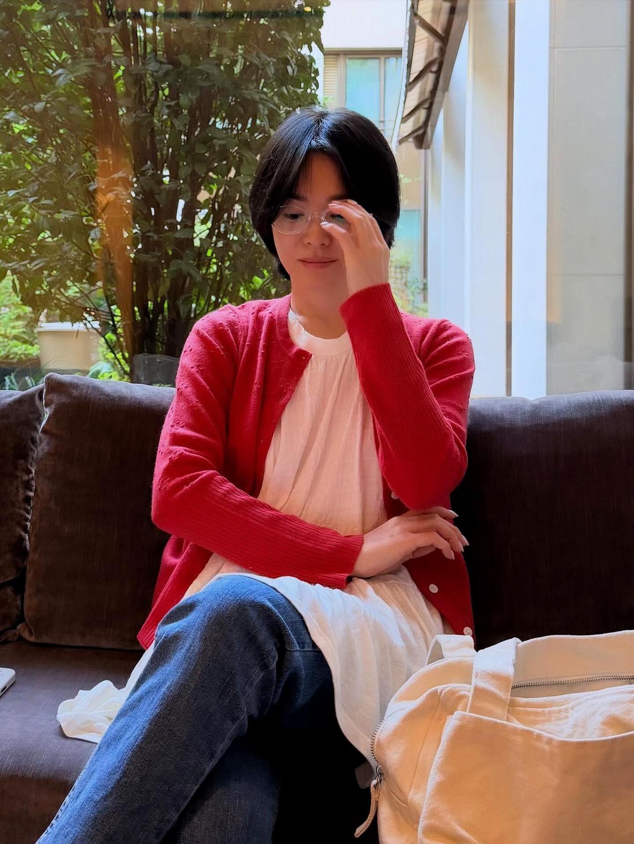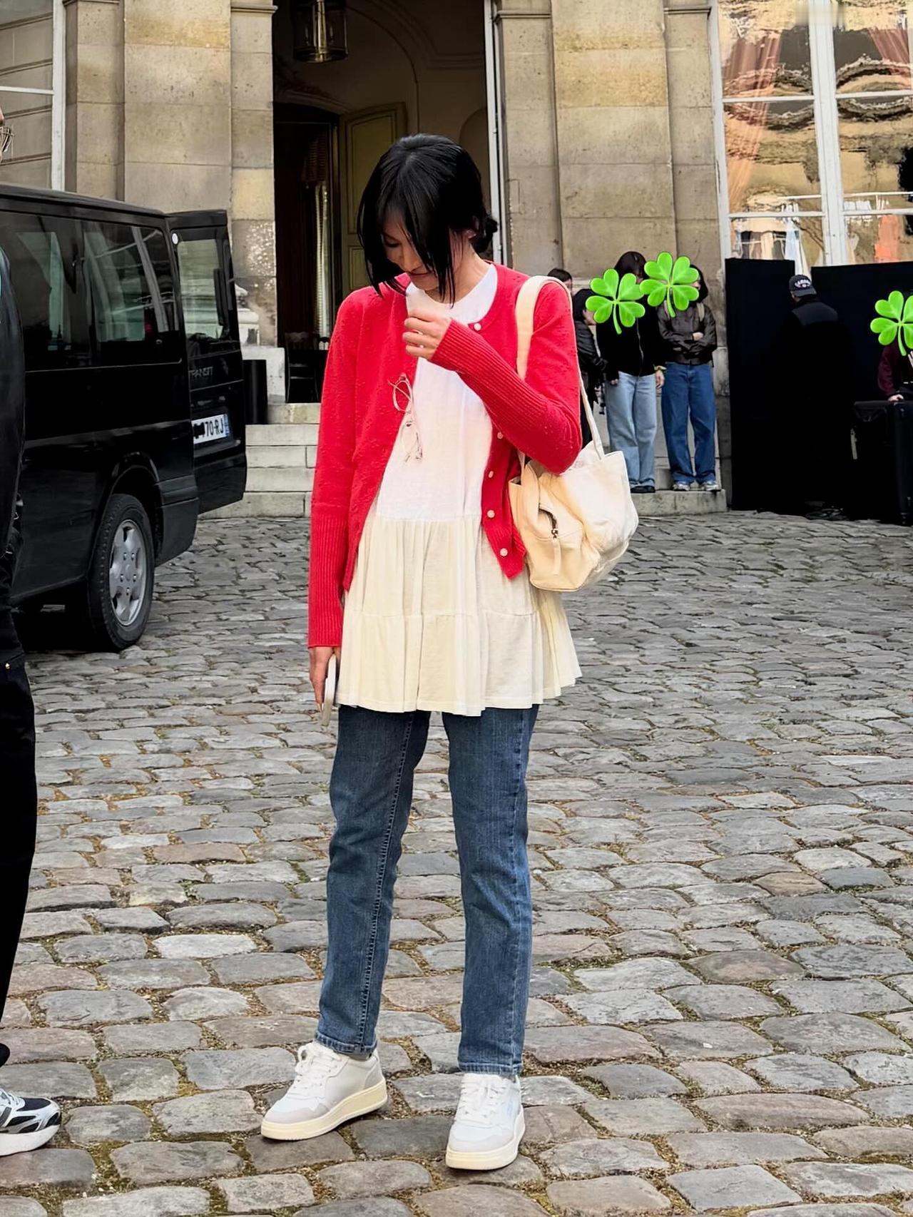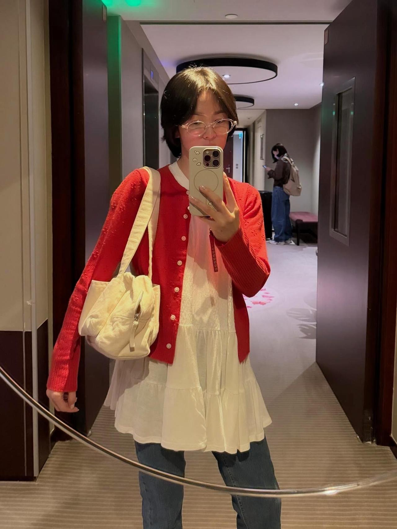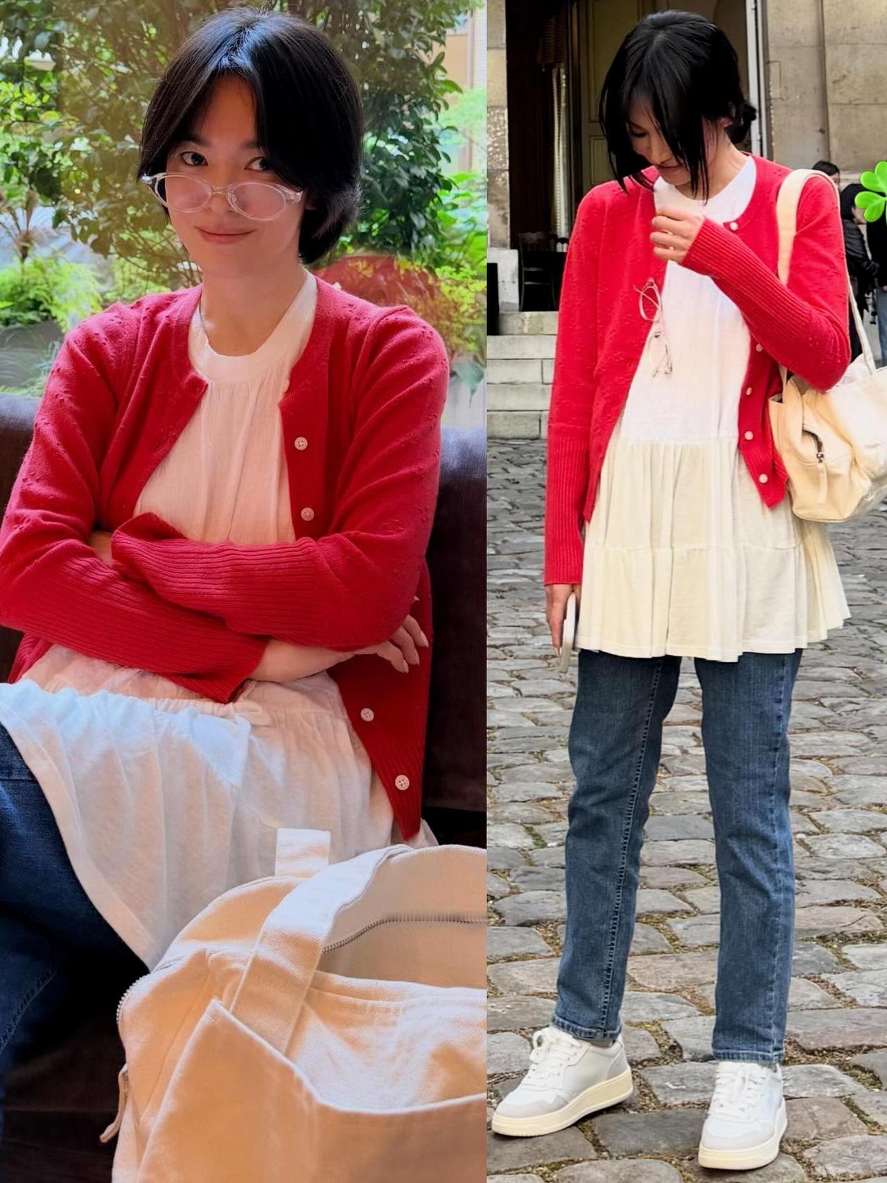宋慧乔街拍,这次的穿搭好少女! 亮眼的红色针织开衫搭配米白色娃娃摆上衣,叠穿牛仔