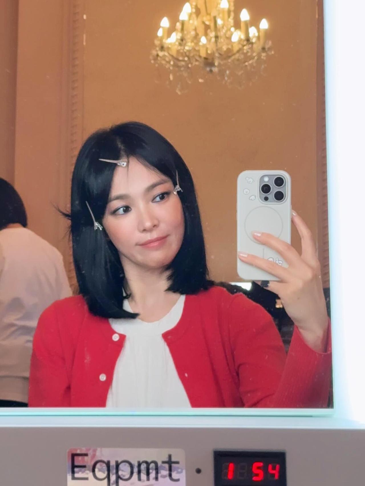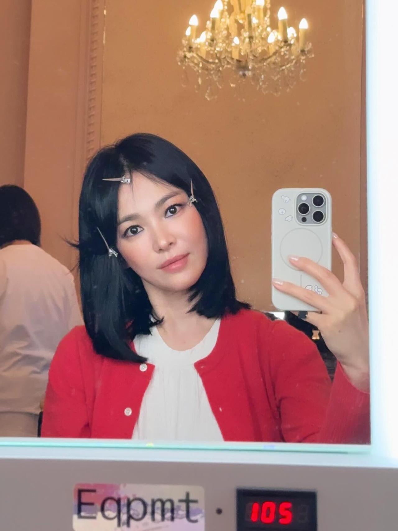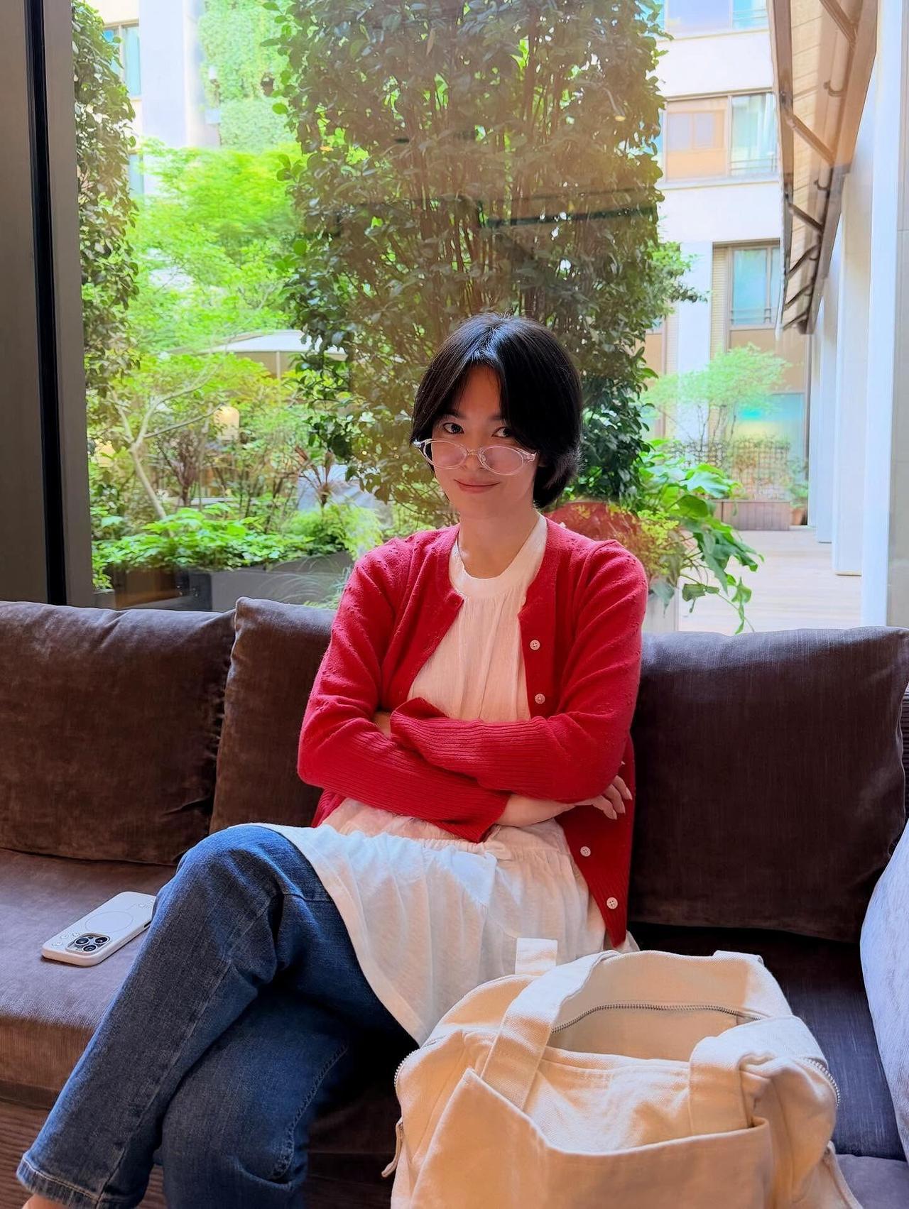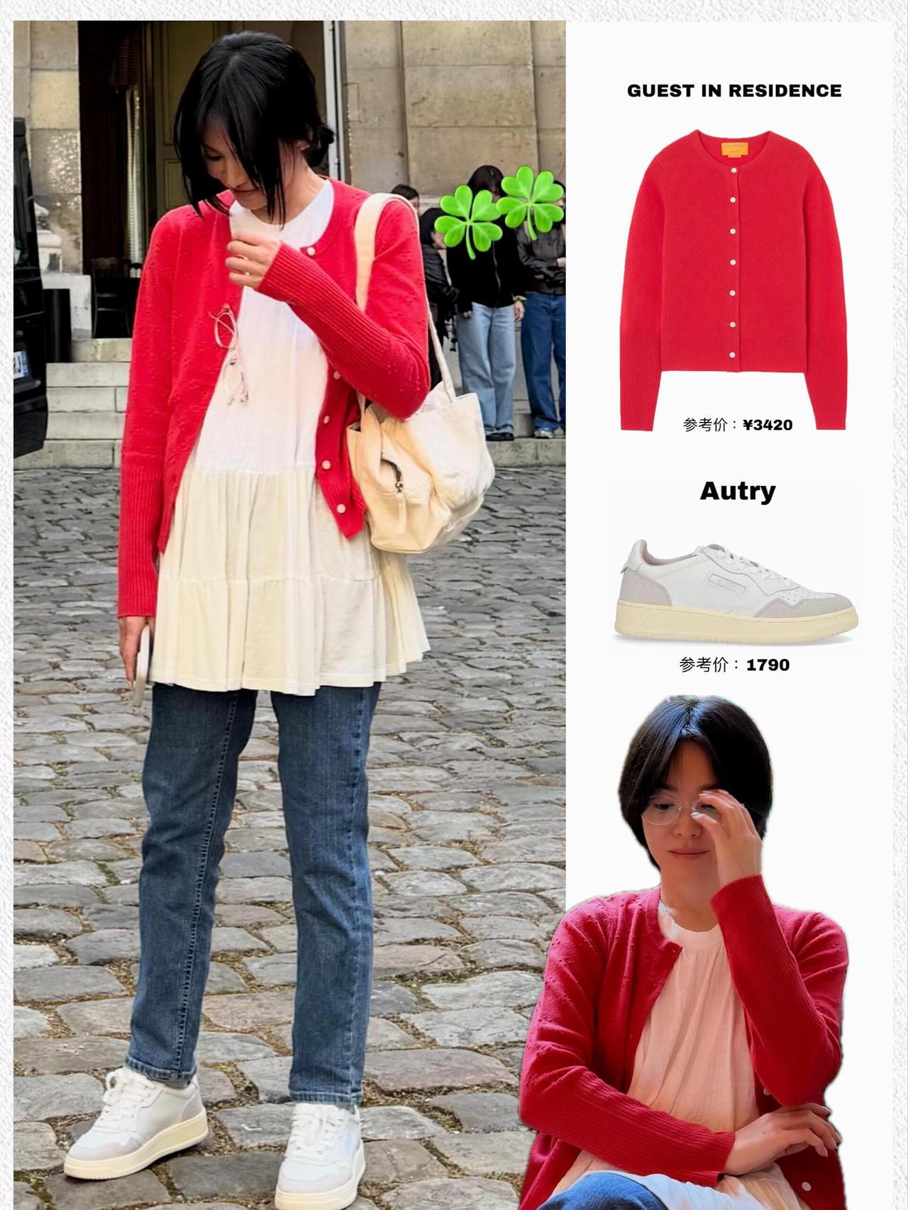 宋慧乔街拍,这次的穿搭好少女! 亮眼的红色针织开衫搭配米白色娃娃摆上衣,叠穿牛仔