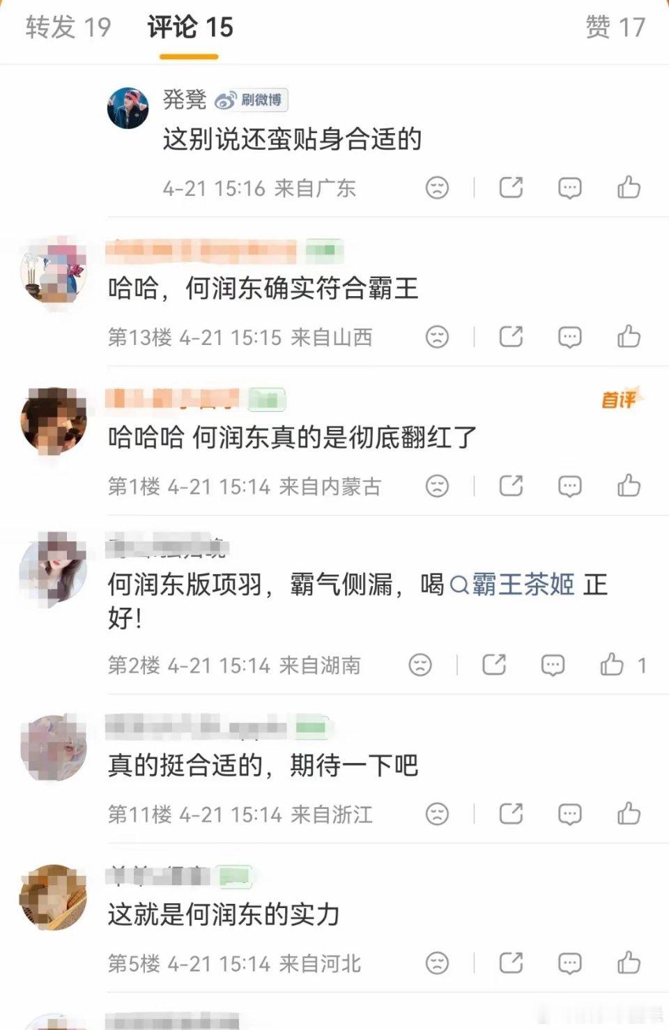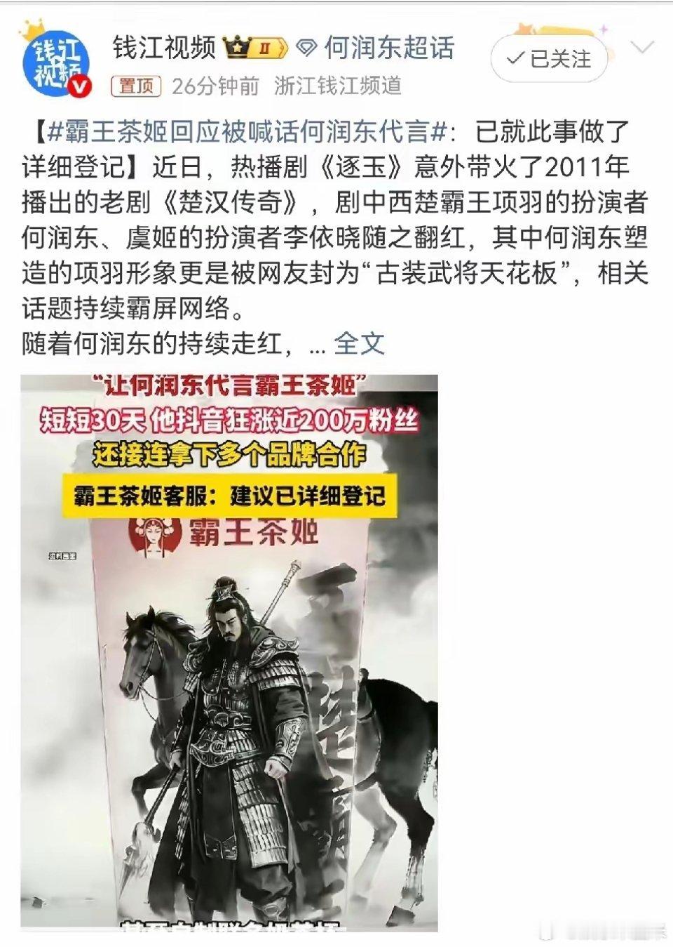 何润东,要忙不过来了!4月21日,网友又给何润东介绍工作了,“霸王茶姬”的客服已经明确回复,称详细登记了网友的建议,何润东和霸王茶姬有望强强联手了。一部热播剧《逐玉》,居然把何润东演的项羽带火了,他直接被网友封为“古装武将天花板”。更绝的是,网友们顺着“霸王”这个点,直接把他和茶饮品牌霸王茶姬锁死了。大家跑到品牌评论区集体喊话,让何润东和剧中虞姬的扮演者李依晓一起代言,甚至还有人自制了联名奶茶杯的图片,催着品牌赶紧行动。说起何润东,他这些年演过不少角色,但这次项羽的翻红,属实是意外之喜。短短30天,他涨了近200万粉丝,还拿下好几个品牌合作,这热度蹭蹭往上涨。而霸王茶姬客服也没让人失望,直接表示已经详细登记了网友的建议。说不定哪天,咱们真能喝到“霸王”代言的奶茶呢!