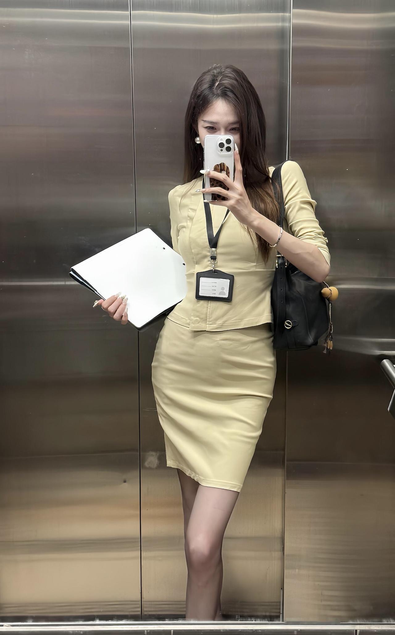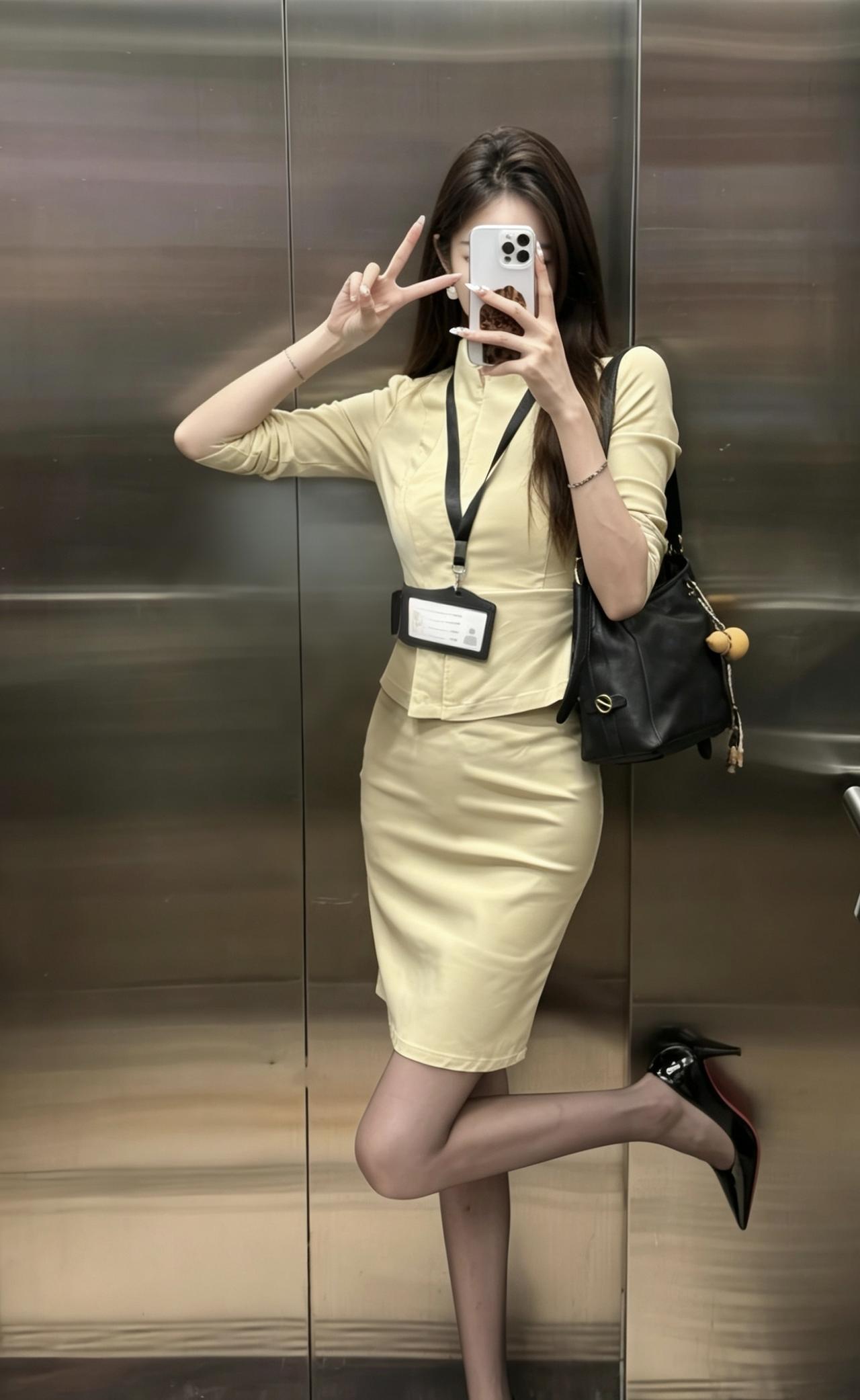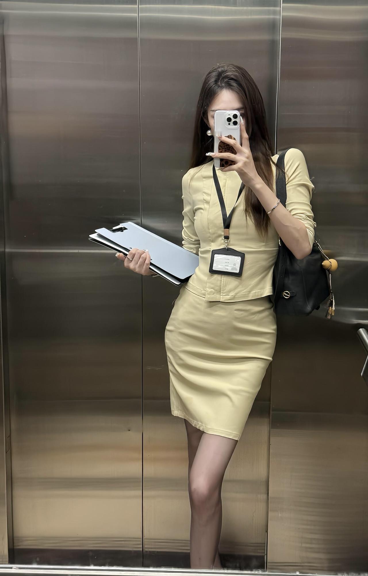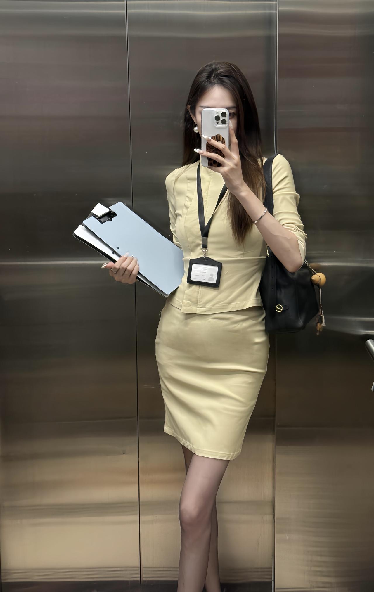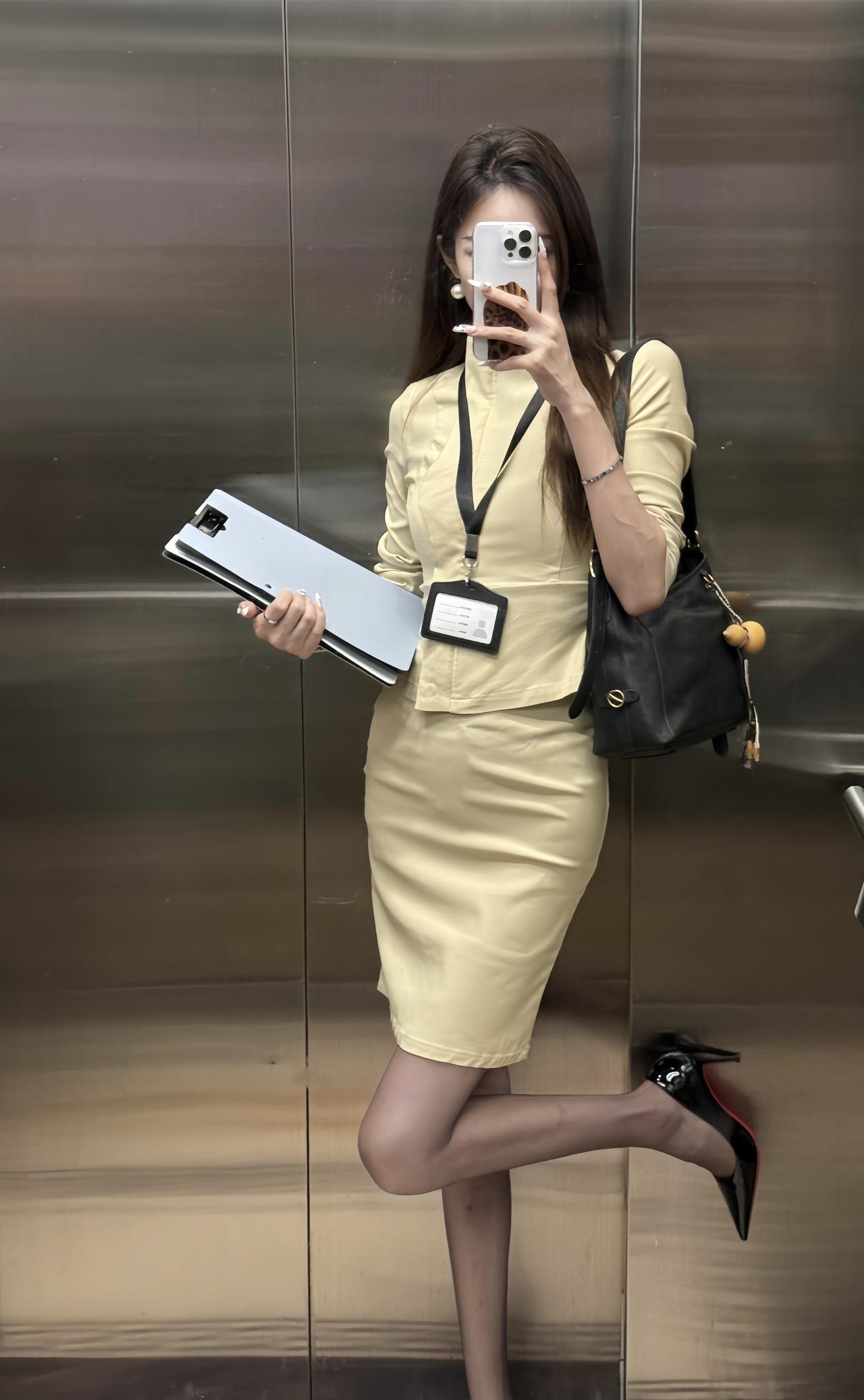 ◦ 上衣+半裙套装:柔和的浅米色(奶黄色)修身套装,剪裁贴合身形,凸显利落线条。立领设计修饰颈部线条,中袖长度适配春秋季通勤,半身包臀裙长度及膝,既保留职业感又不失女性柔美。