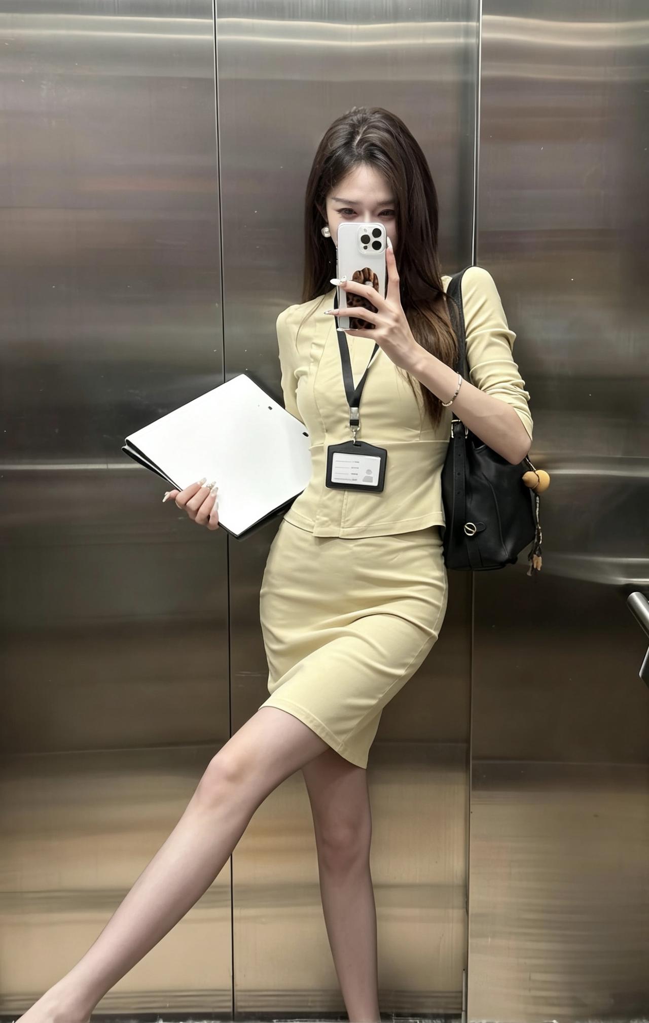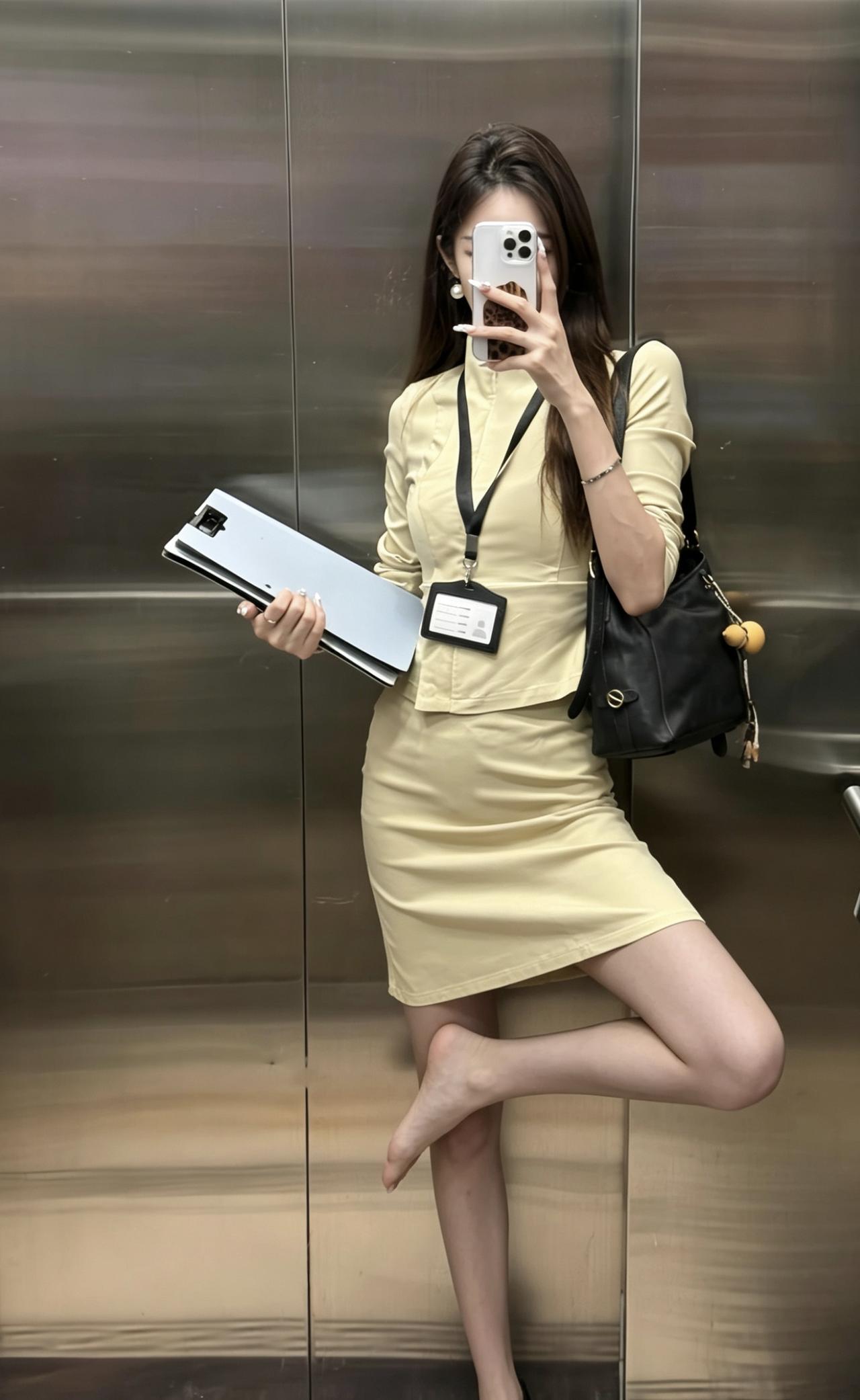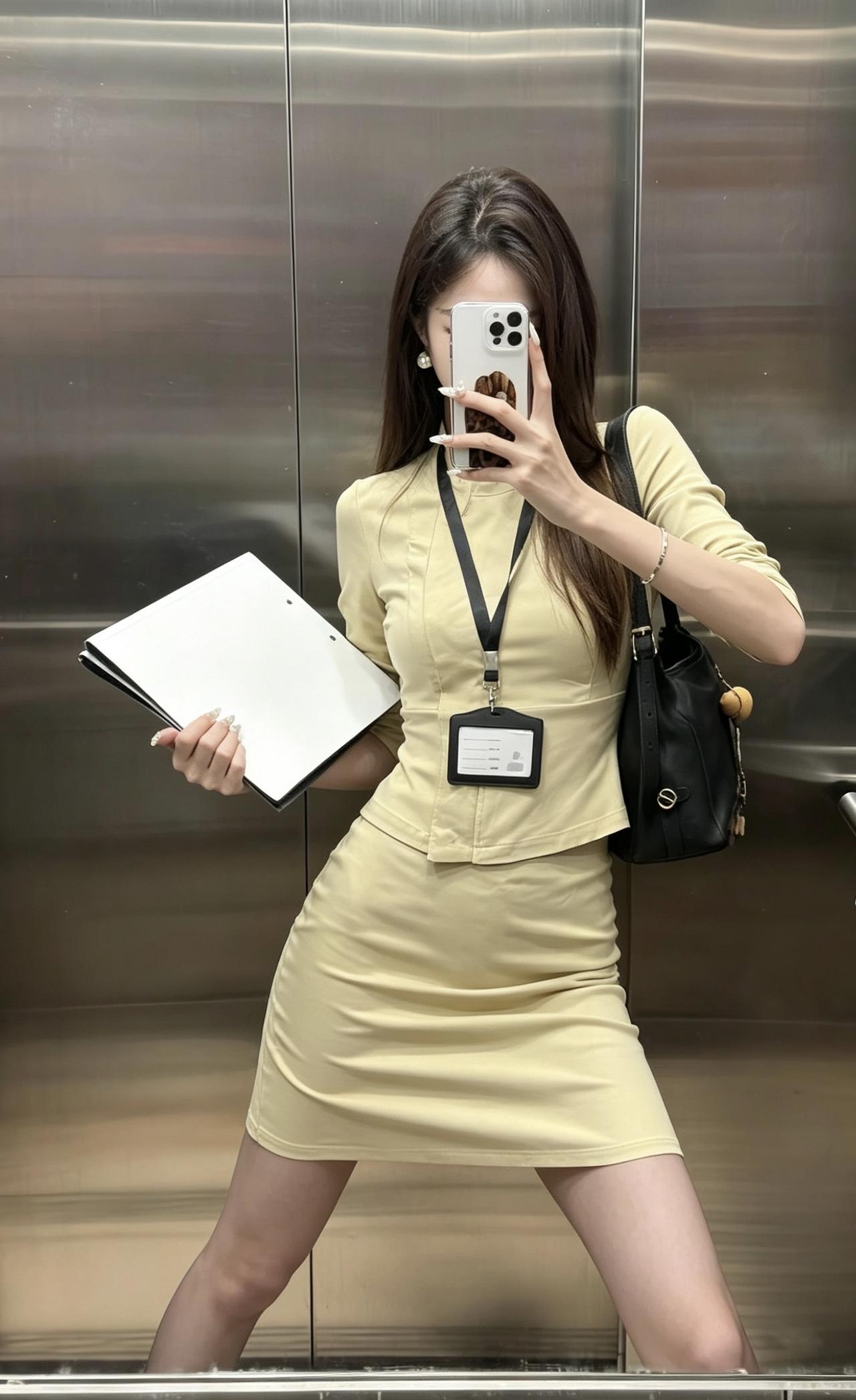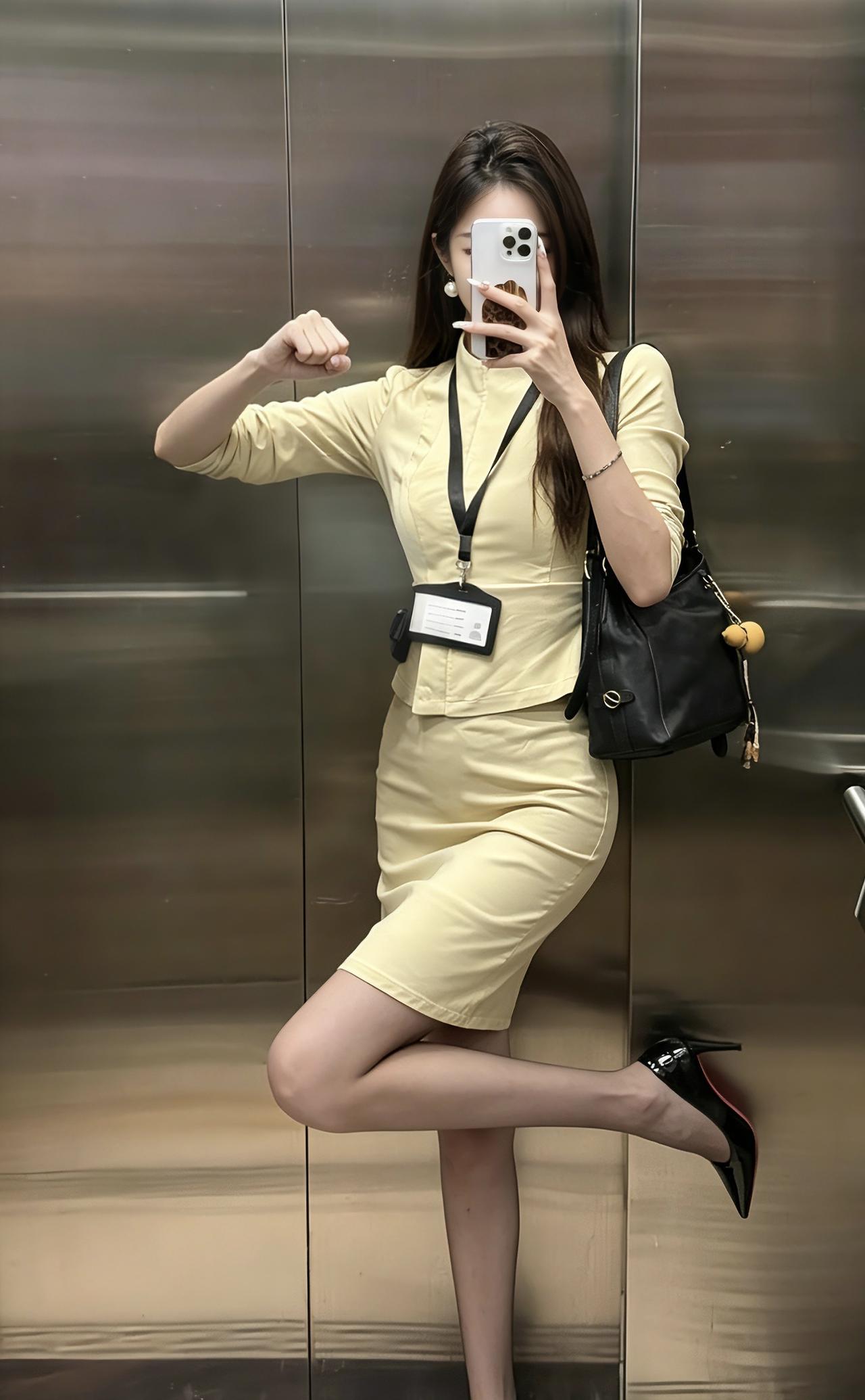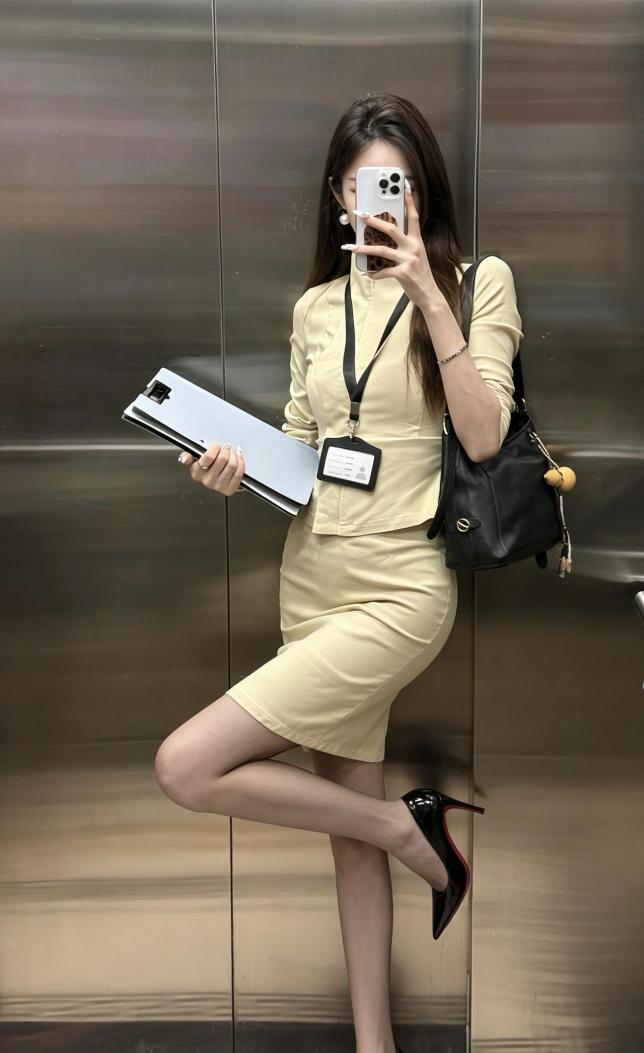 ◦ 上衣+半裙套装:柔和的浅米色(奶黄色)修身套装,剪裁贴合身形,凸显利落线条。立领设计修饰颈部线条,中袖长度适配春秋季通勤,半身包臀裙长度及膝,既保留职业感又不失女性柔美。