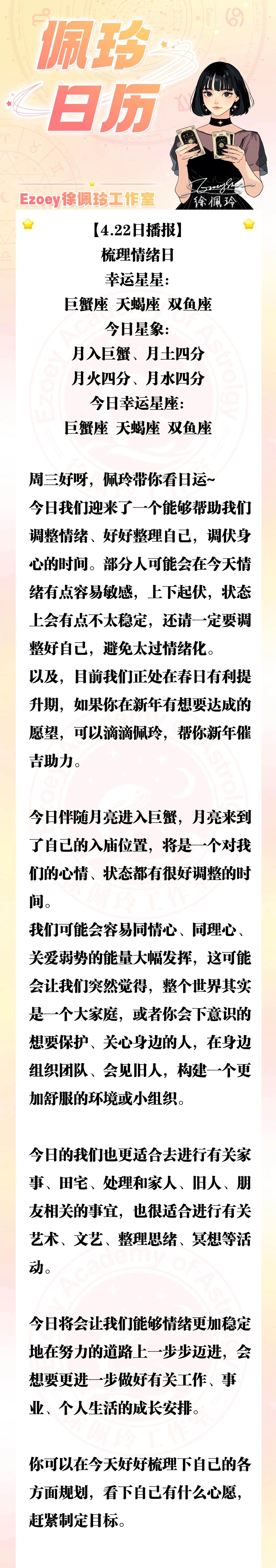 【4.22日播报】梳理情绪日 幸运星星:巨蟹座、天蝎座、双鱼座——Ezoey徐佩