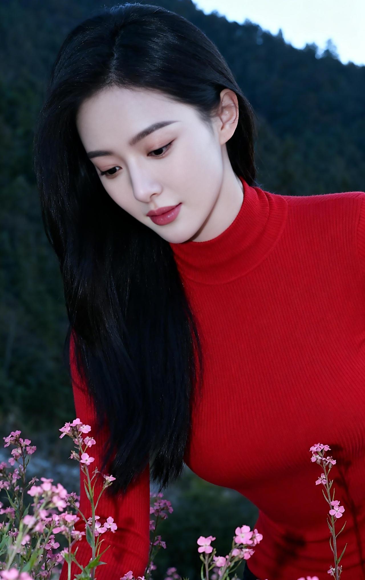 春日山野间,红衣胜花,不刻意张扬,却在光影交错间,将东方女子的柔与韵,定格成一幅