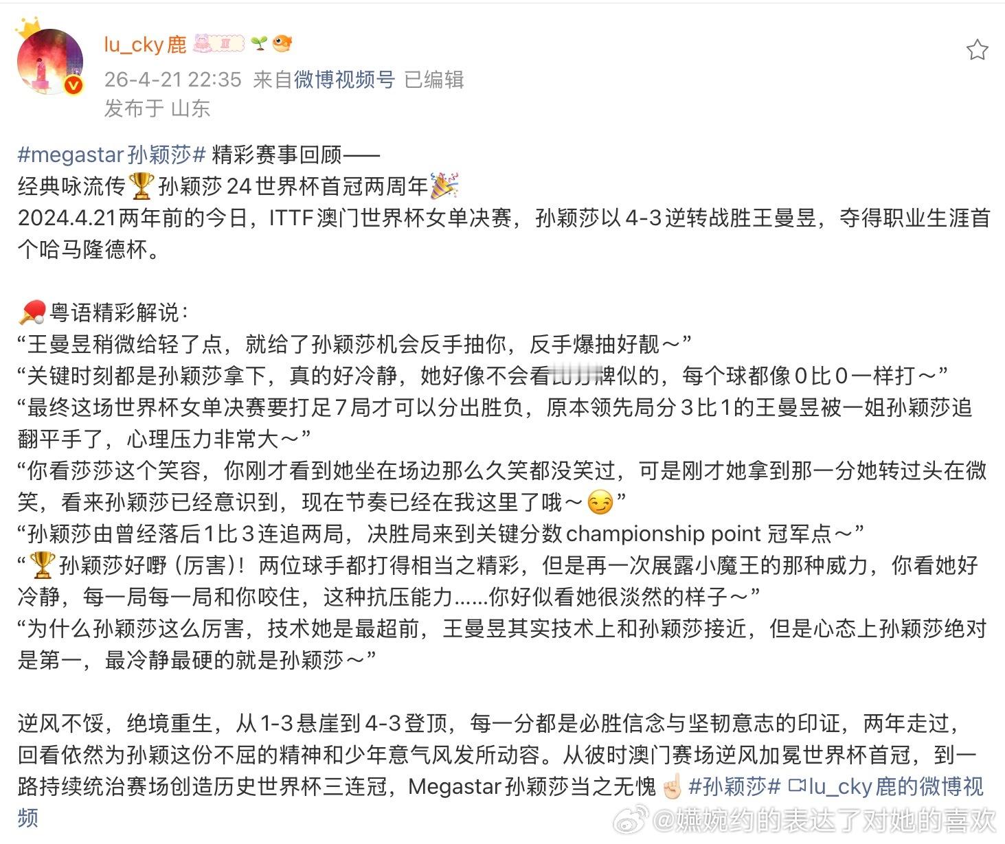 回想起来两年前的今天,2024年澳门世界杯,王曼昱粉丝曾经赛前许愿干干净净打球的孩子会得到乒乓球女神的眷顾拿到第一个改制后的世界杯冠军,在郫县求呀求呀,最后被孙颖莎逆转拿了第一个世界杯冠军,鱼丝到处散发洗脑包,想破坏我孩子路人缘,最后孙颖莎这场比赛的暂停面对观众席背影大出圈,比赛气质也大出圈,吸到好多球迷入坑。但是王曼昱粉丝最后许愿成功了,两年后的乒乓球女神也一直眷顾了干干净净打球的孙颖莎