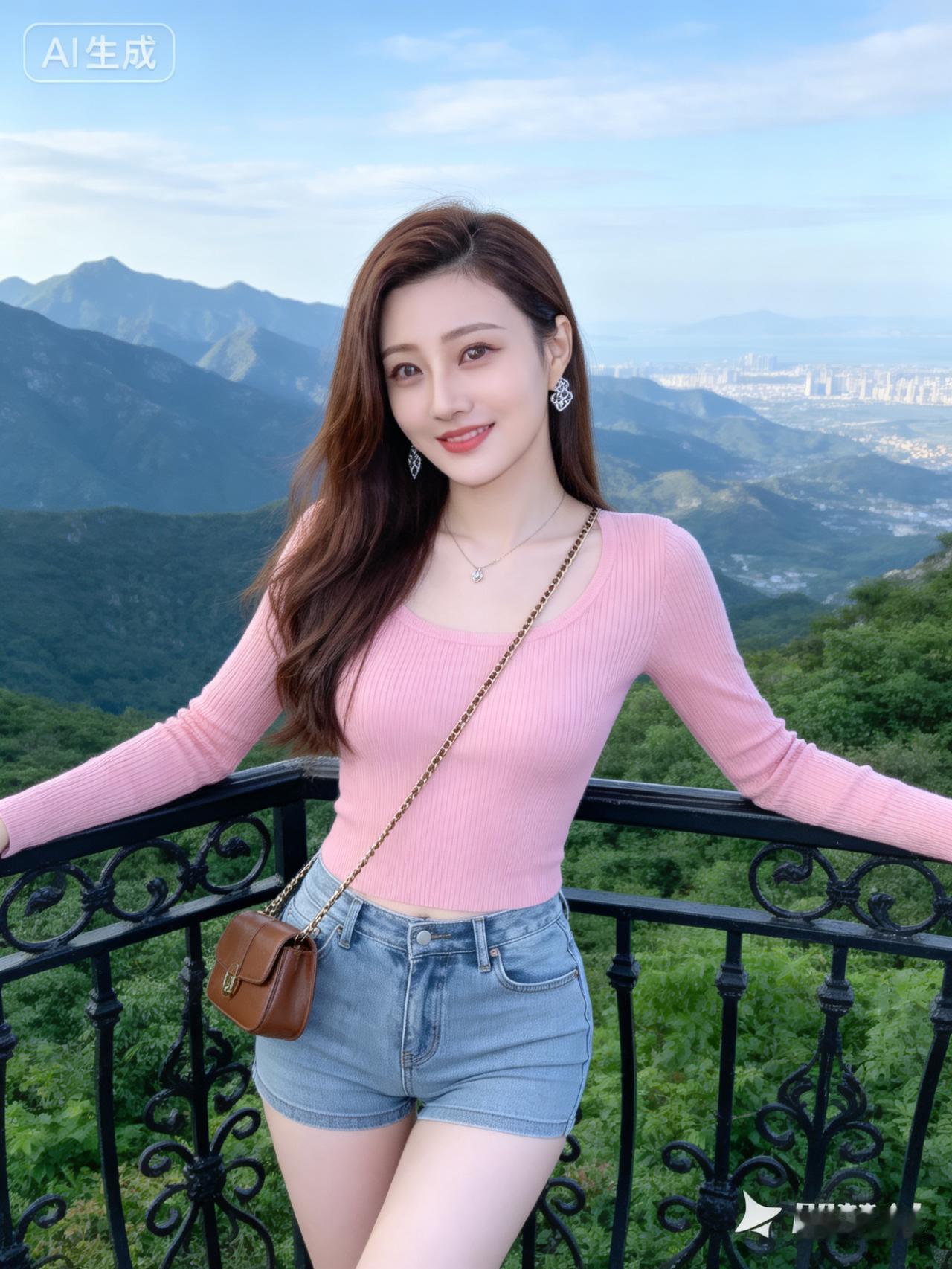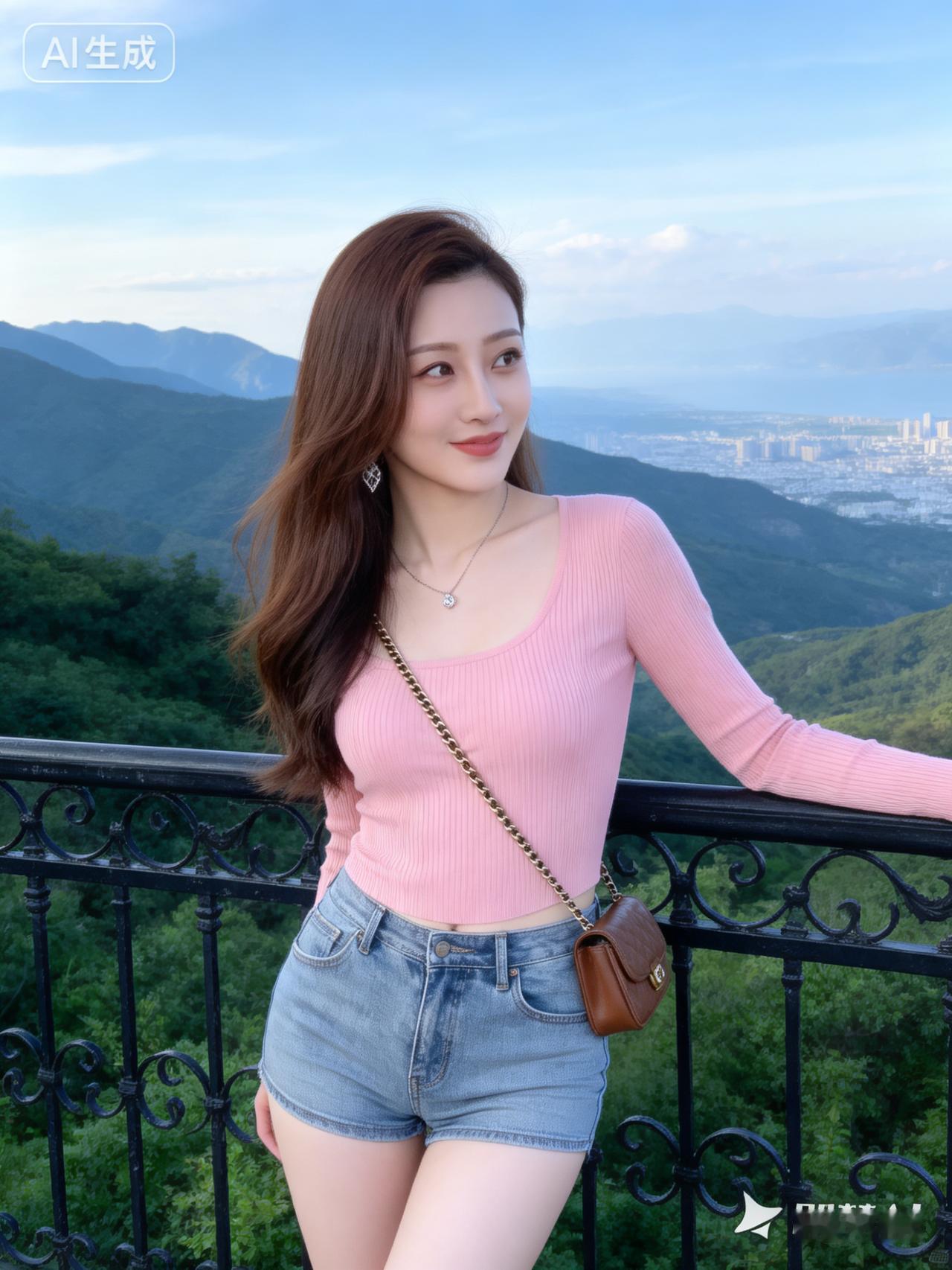 少女心爆棚的粉色毛衣搭配牛仔短裤,在山间美景中打卡🌿💖