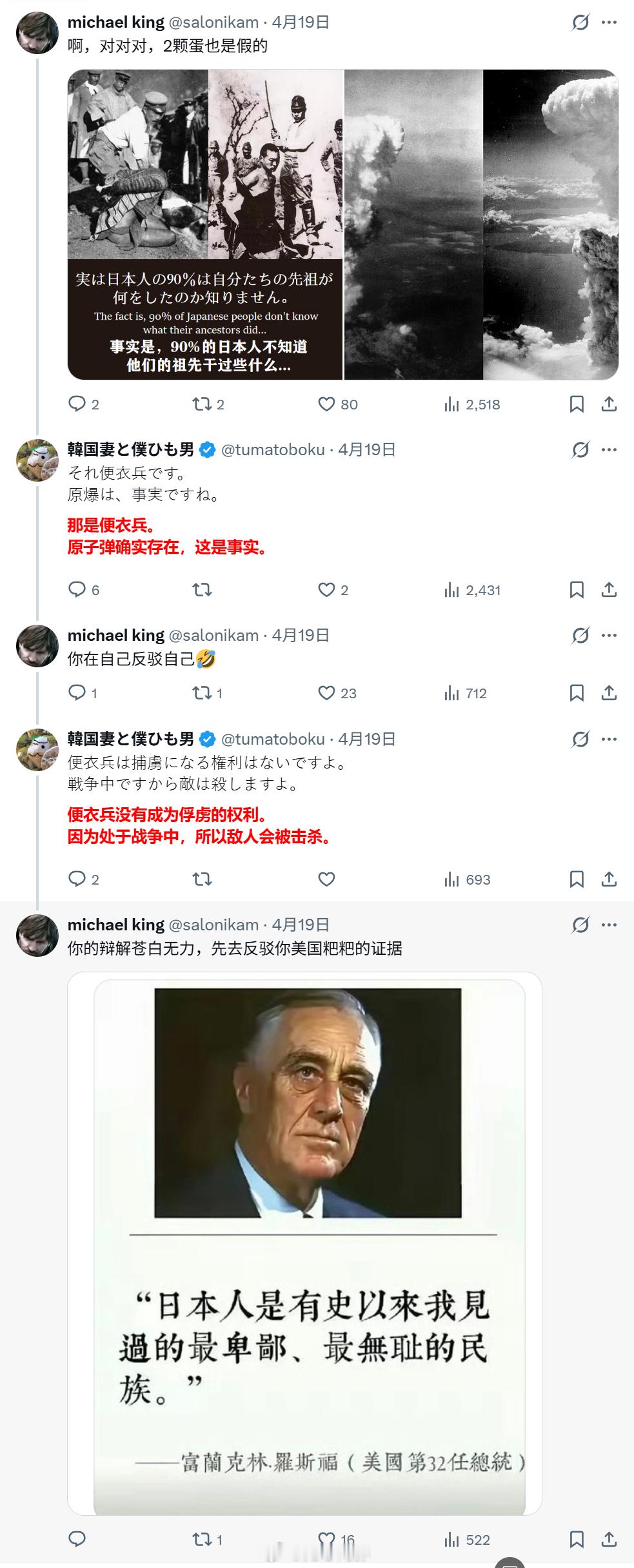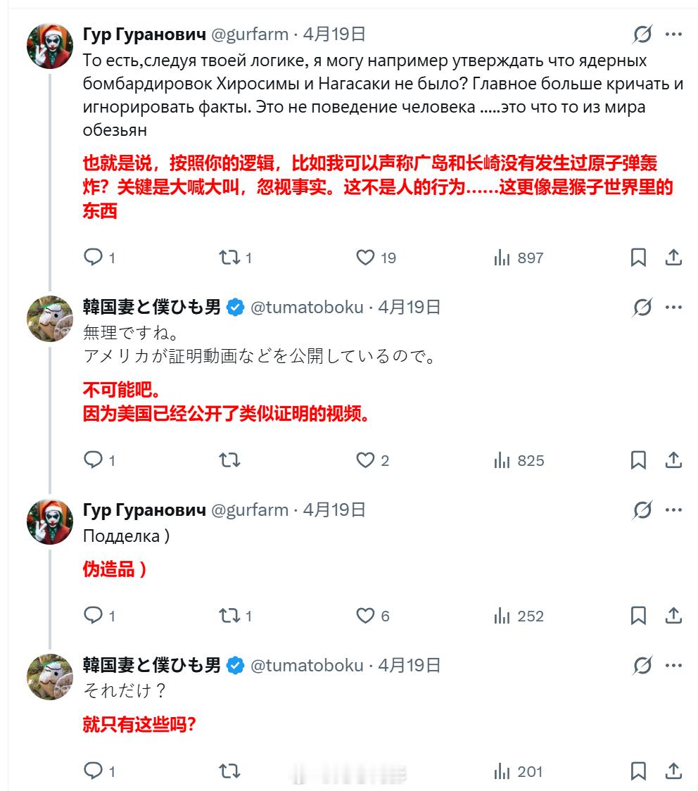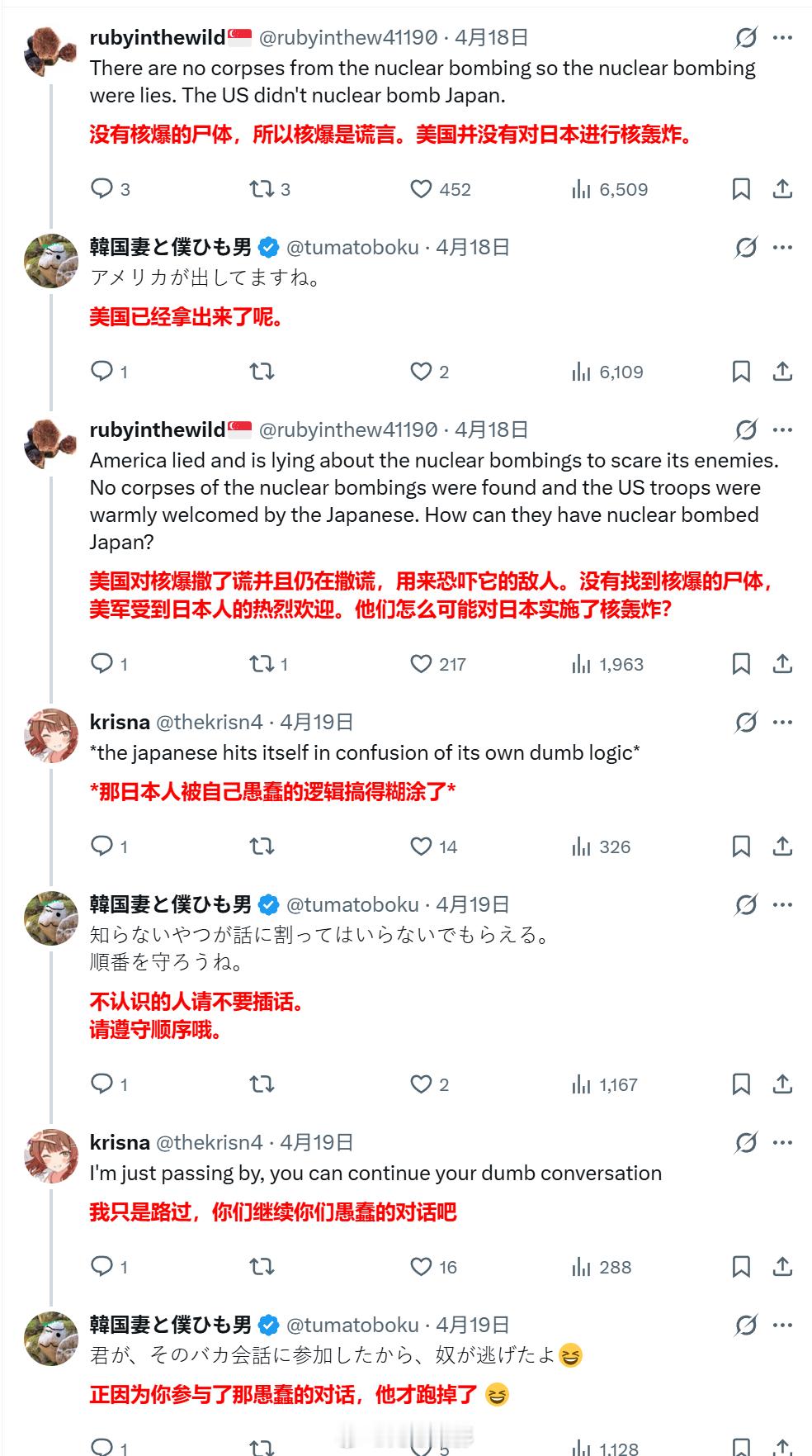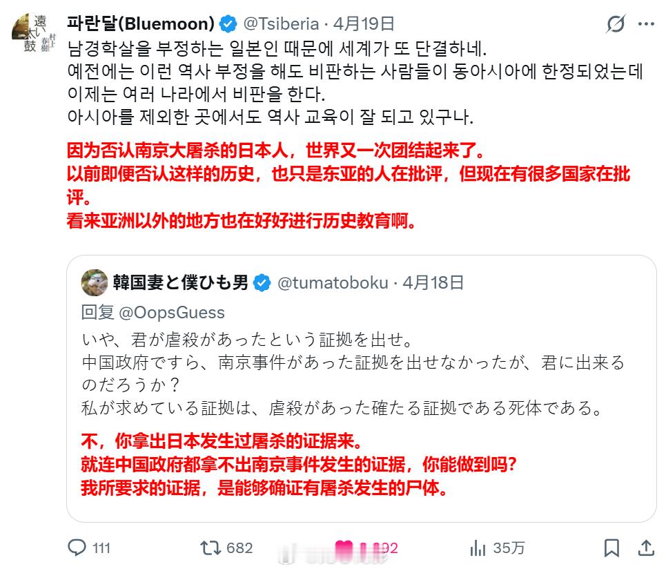 在推特将日文内容自动翻译给全世界的背景下,一名日本人坚决否认发生过南京大屠杀,嘴硬得跟茅坑里的石头一样,但这次跟以前不一样了,以前是中国人和他们撕,这次多了很多其他国家的网民和他撕——但这货是真的嘴硬啊。