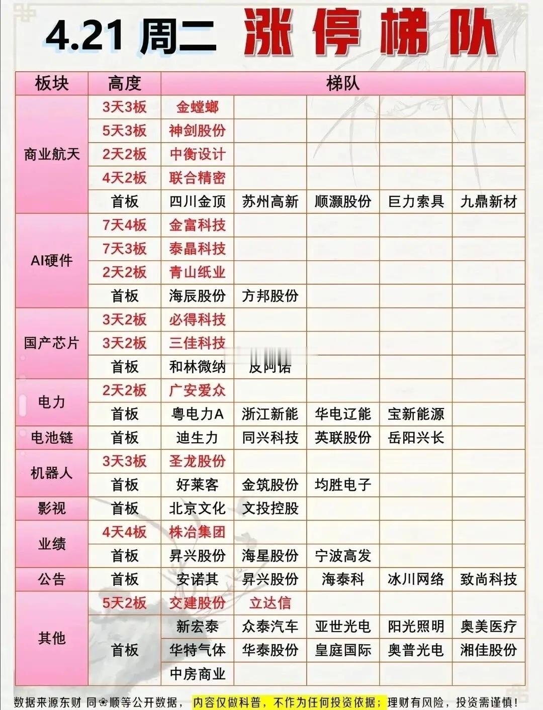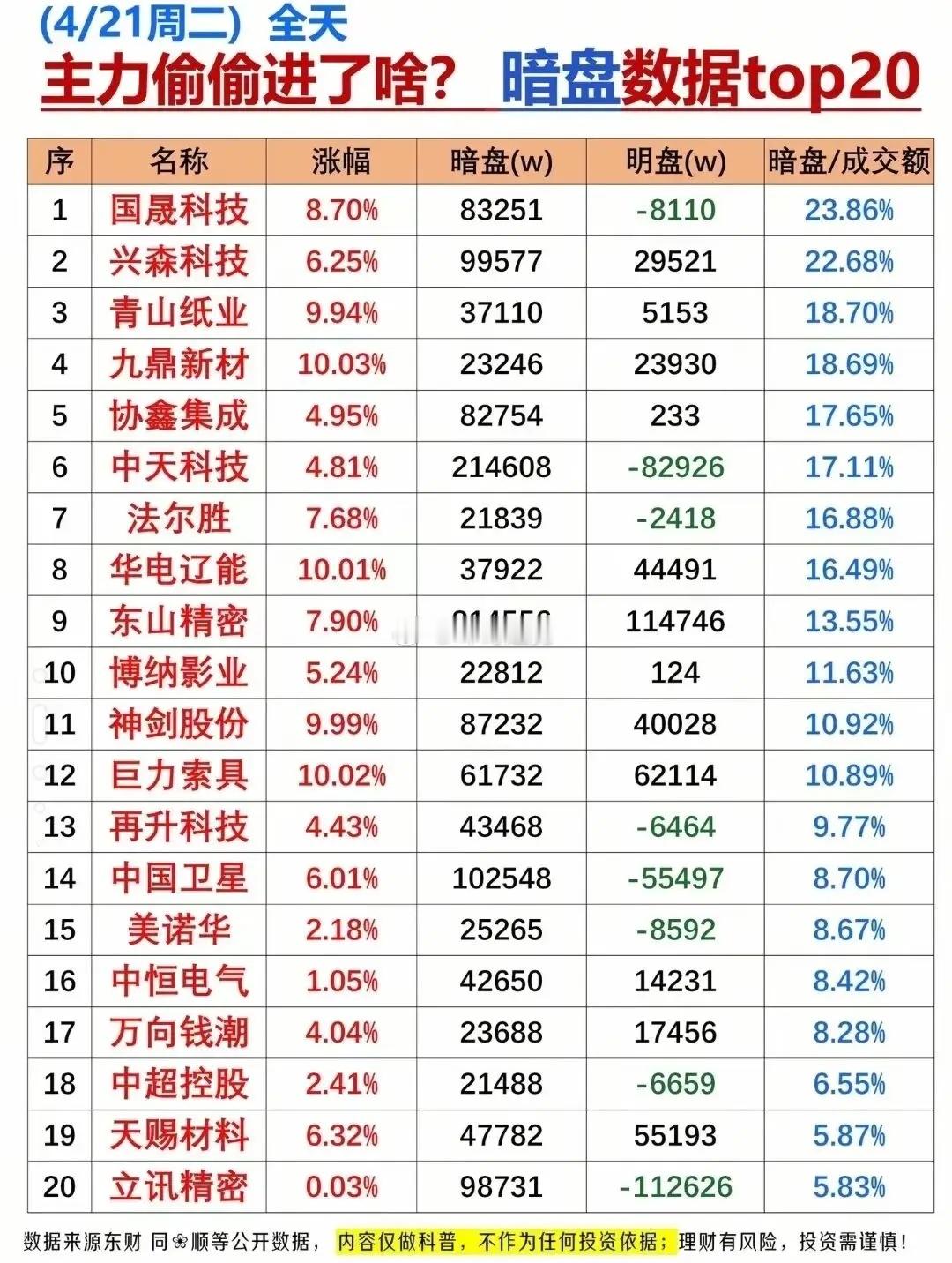 4月21日A股全天复盘资料来了!今天三大指数涨跌不一,三市成交总额缩量至24268亿,主力资金净流出532.23亿,个股跌多涨少,涨停65家、跌停19家,市场情绪整体趋于谨慎。资金流向层面,主力资金调仓换股特征显著。电池、元件、化学制品等板块获主力净流入,成为当日资金避风港;个股端,N盛合、宁德时代、紫金矿业等个股获主力大额净流入,而立讯精密、润泽科技、天孚通信等个股资金出逃明显。暗盘数据与游资动向进一步印证市场节奏变化。国晟科技、兴森科技、青山纸业等个股暗盘成交额占比居前,资金潜伏意愿浓厚;游资席位上,章盟主、作手新一、炒股养家等顶级游资现身,章盟主买入九鼎新材1.28亿、华电辽能7392万,作手新一卖出英维克1.13亿,游资分歧与切换加快。涨停梯队中,商业航天、AI硬件、国产芯片成为核心主线。株冶集团走出4天4板业绩龙头,金富科技7天4板、泰晶科技7天3板领跑AI硬件,金螳螂、圣龙股份斩获3天3板,商业航天板块的神剑股份、联合精密等个股也强势连板。整体来看,当日市场缩量调整下科技主线分化加剧,资金聚焦高景气细分赛道,后续需关注量能能否有效修复以及主线板块的持续性。今日看盘A股乌克兰进入破产倒计时