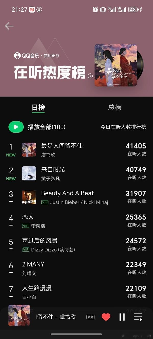 虞书欣新歌26分钟日榜一,已超比伯