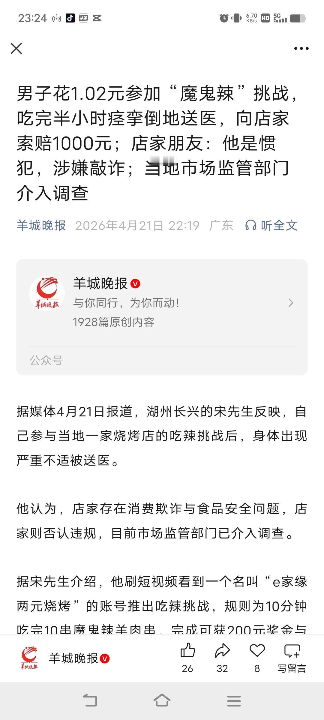 浙江湖州,男子花1块钱在一家烧烤店参加“魔鬼辣”羊肉串挑战,不料,吃完半小时后,疼得倒地痉挛被送医,男子觉得太冤,事后,找店家索赔1000块,没想到,店家直接说他是“惯犯”,分明是敲诈,网友:偷鸡不成蚀把米。