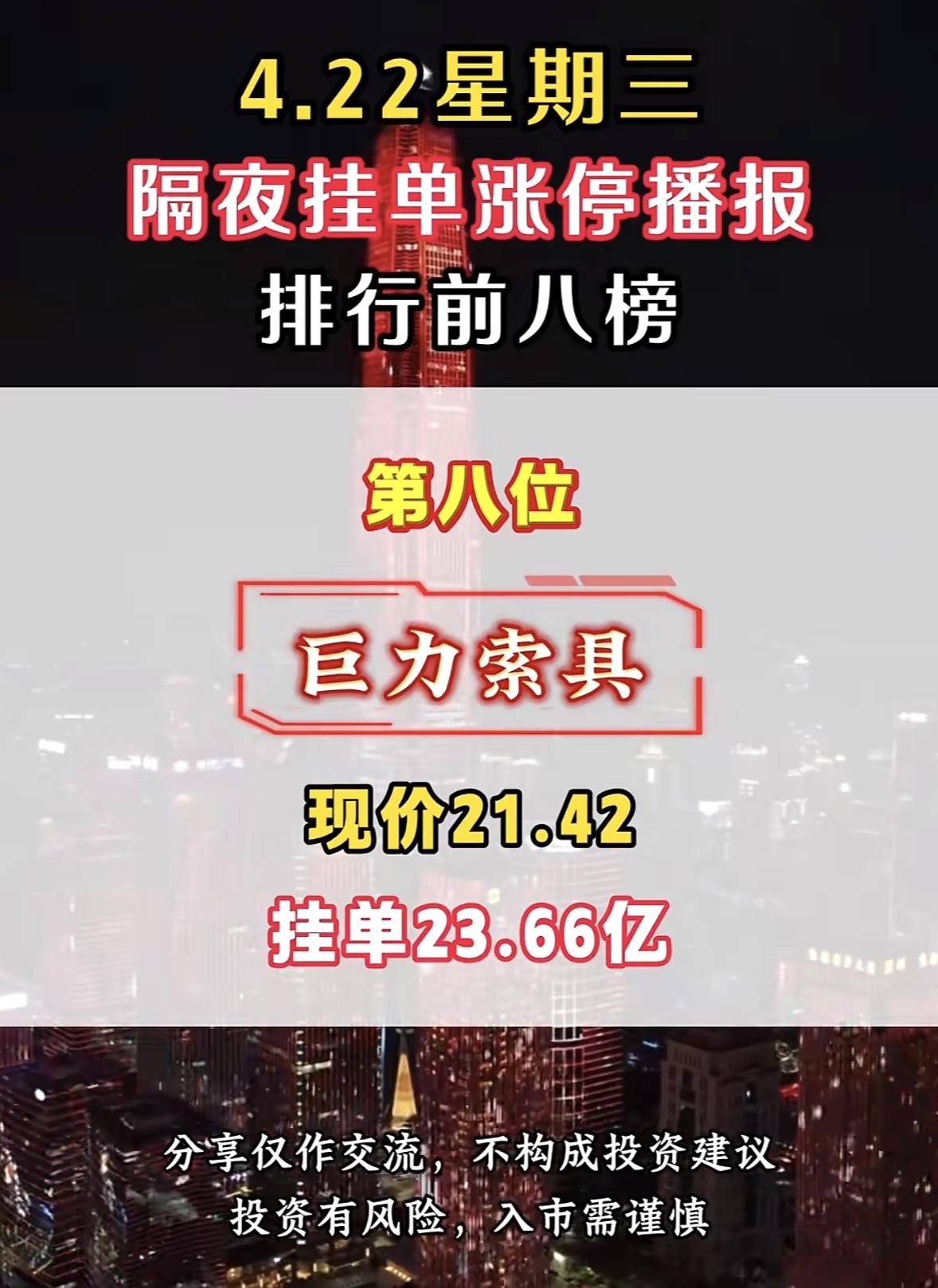 4.22的股市隔夜挂单榜前八里,巨力索具相当惹眼。现价21.42的它,挂单金额竟高达23.66亿。这数字一出来,就像在股市里投下了一颗炸弹。这么大的挂单量,说明很多投资者都在关注它。也许有人是看好它未来的发展潜力,想提前布局;也有可能是机构在搞大动作。不过这巨额挂单也像一把双刃剑,要是后续没有足够利好消息支撑,也可能引发股价波动。反正巨力索具现在成了股市里的焦点,后续走势值得好好盯着。