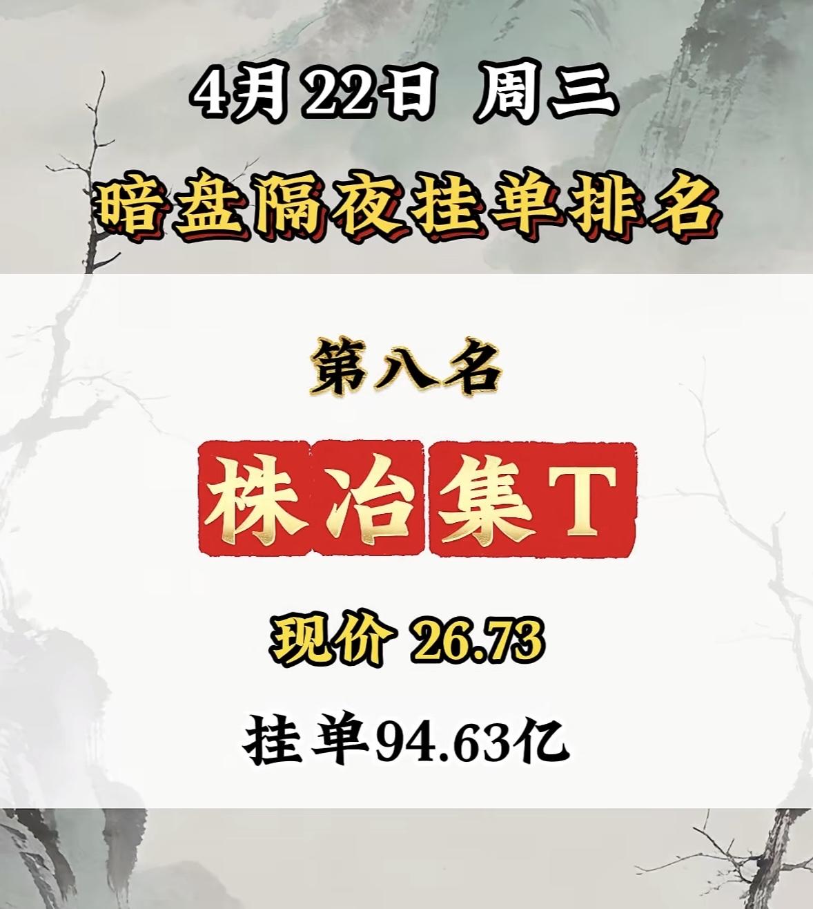 4月22日株冶集团有点猛啊,现价26.73,挂单高达94.63亿,暗盘隔夜挂单排第八!前一天4月21日,它就有72.8亿挂单,当时是靠金属涨价和业绩翻倍,在区间震荡吸筹。看看当天其他热门股,神剑股份挂单92.6亿排前面,靠一季报预增和算力合同吸引主力。再瞧瞧4月22日暗盘隔夜挂单,神剑股份挂单155.56亿稳坐第一。株冶集团这次挂单大幅增加,后续走势很值得关注,说不定会带来新惊喜,咱就拭目以待!