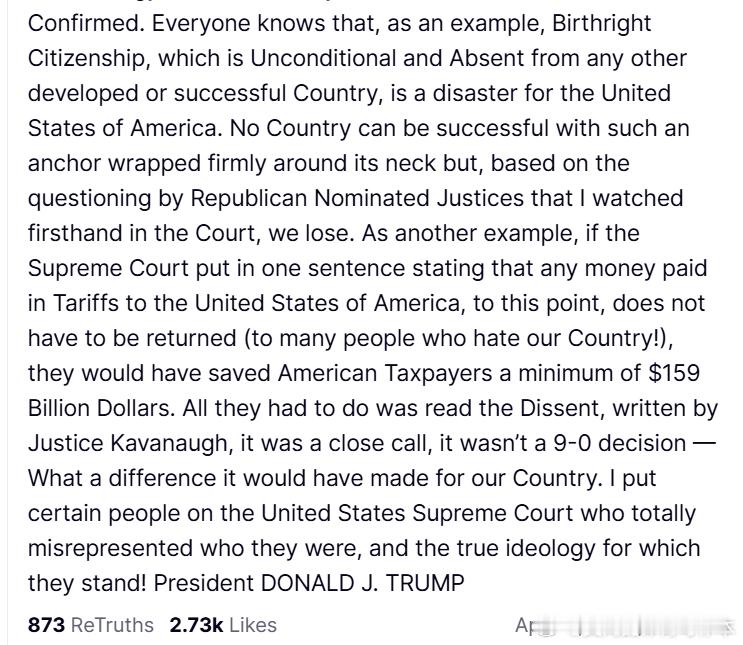 【黄金时代】川普透露,根据他在最高法旁听的法官质询,最高法将不同意川普打掉出生公民权