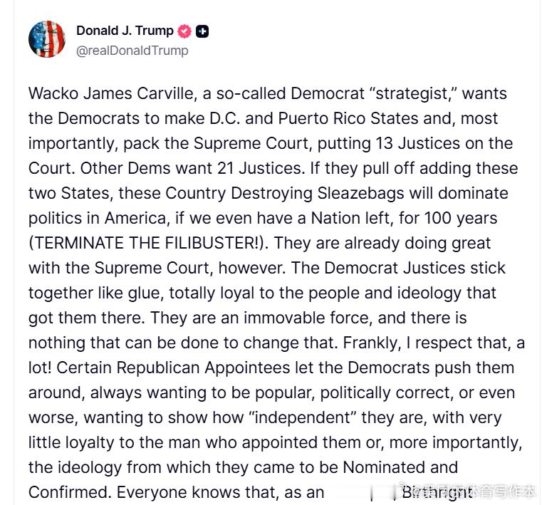 那个疯子詹姆斯·卡维尔,一个所谓的民主党“策略师”,想让民主党把华盛顿特区和波多黎各变成州,更重要的是,他想让最高法院扩充,把大法官人数增加到13人。其他民主党人则想增加到21人。