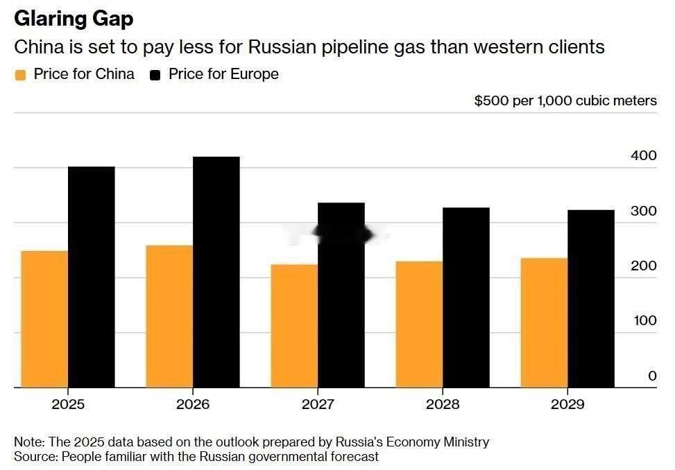 消息人士因计划尚未公开而要求匿名,他们表示,未来三年这一价格差距将逐步缩小,但到2029年仍将略高于27%。去年,俄罗斯向中国出售天然气的平均价格为每千立方米248.7美元,同样比欧洲的平均价格低38%以上。