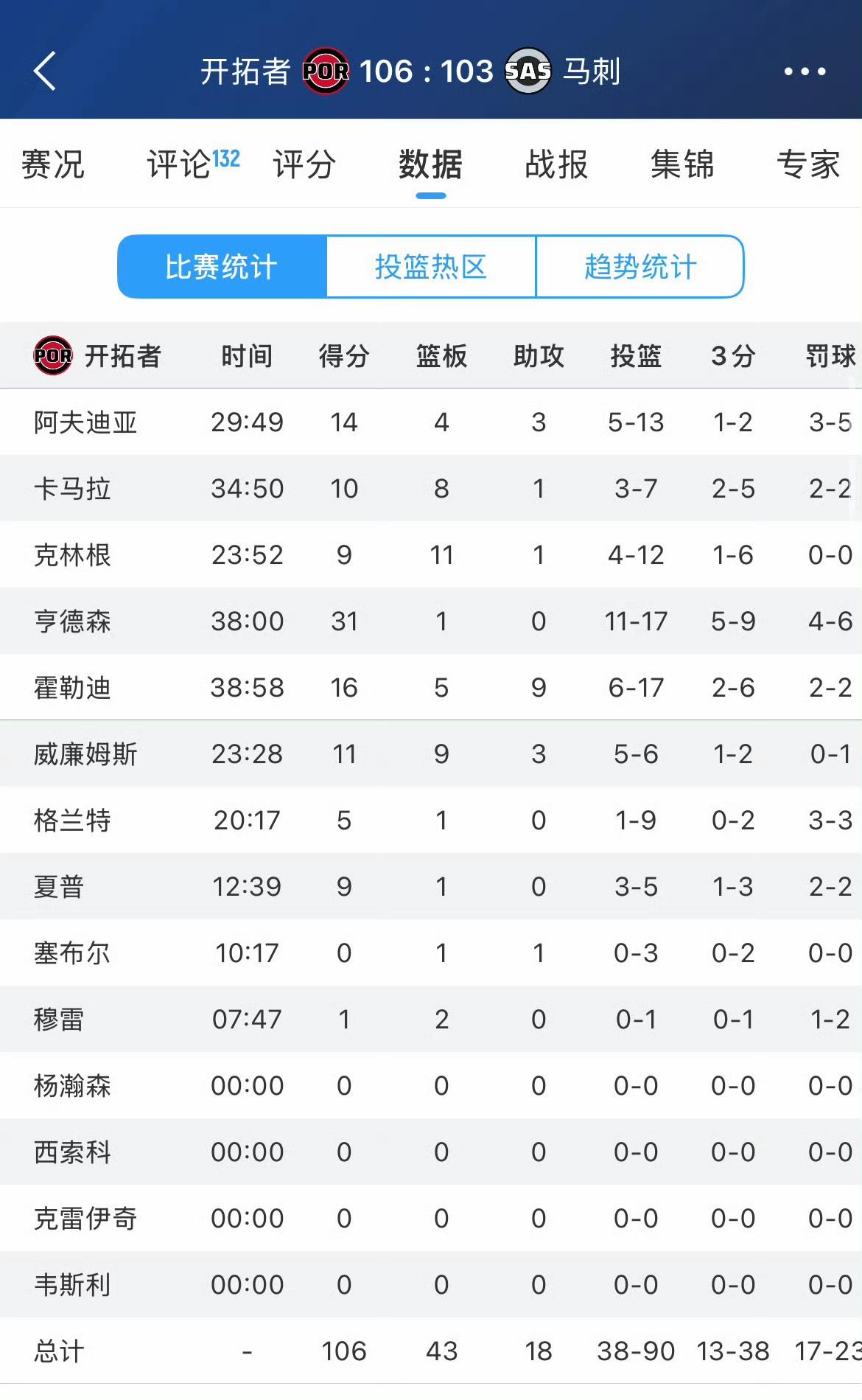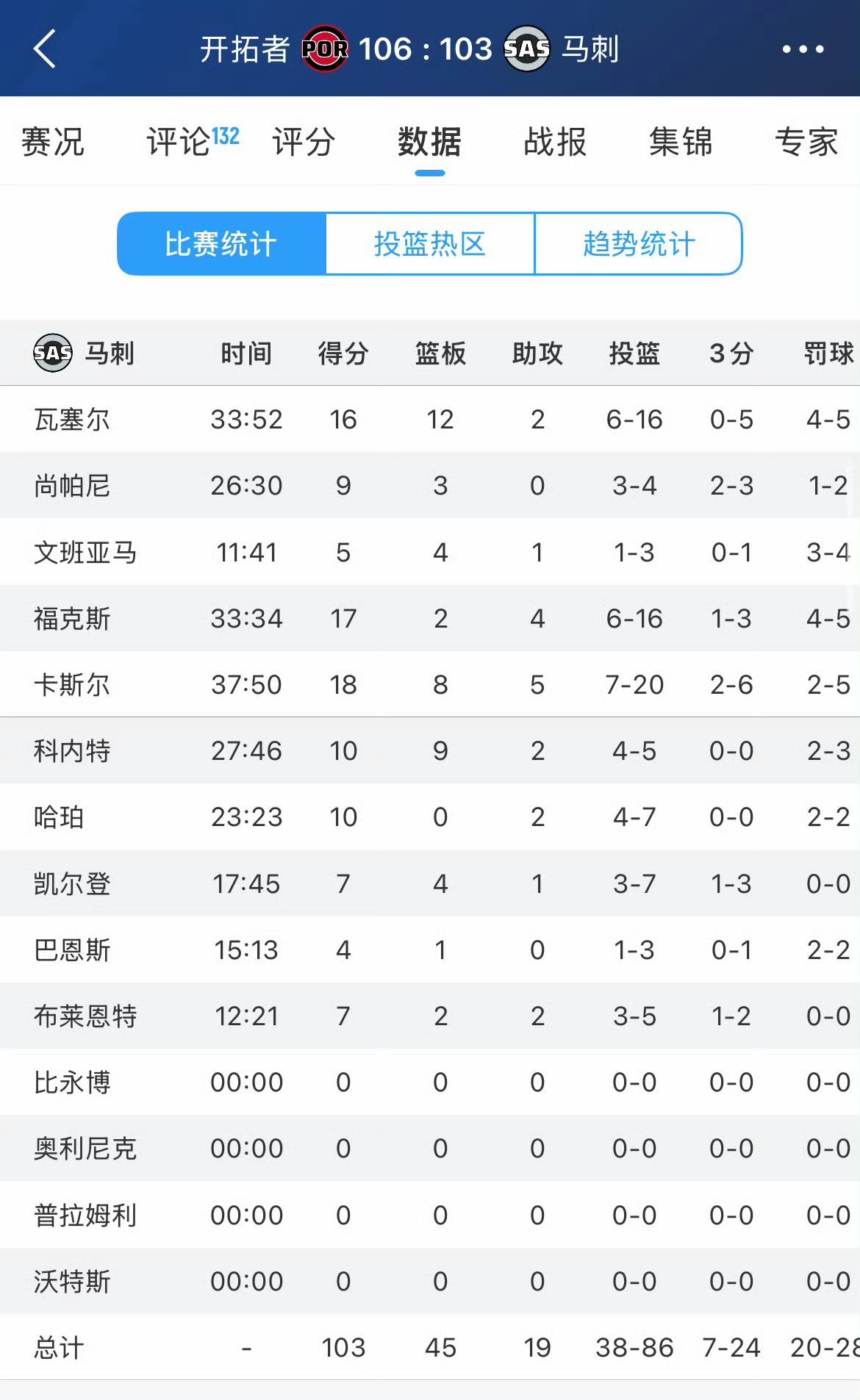 在文班伤退后,开拓者体型优势出来了,至少今天给外线压力做得不错,马刺全队三分只有24中7。