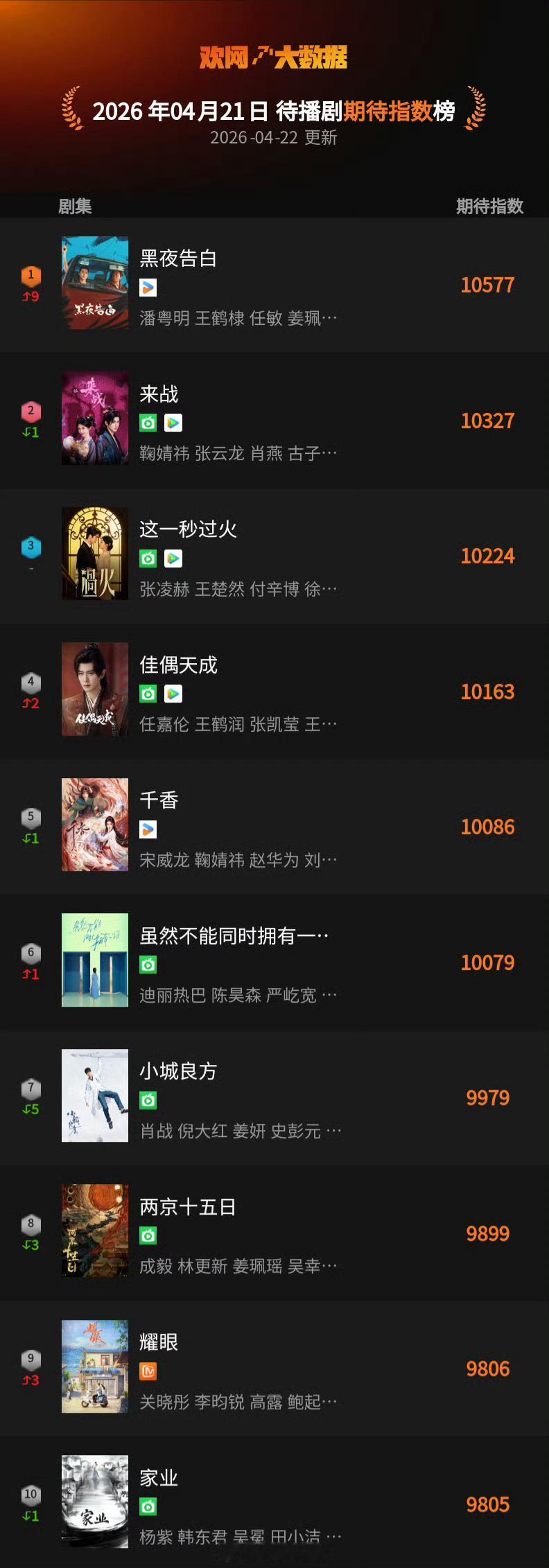 待播剧期待指数top排名鞠婧祎《来战》《千香》前五占二,长期霸榜,期待值超高的❗