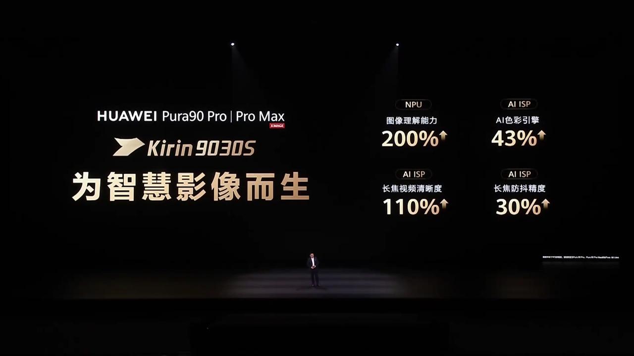 麒麟9030S虽然性能方面不如麒麟9030Pro,但重点加强了NPU和AI能力以提升影像处理能力,图像理解能力提升200%,AI色彩引擎提升43%,长焦视频清晰度提升110%,长焦防抖精度提升30%,更符合Pura系列影像旗舰的定位。