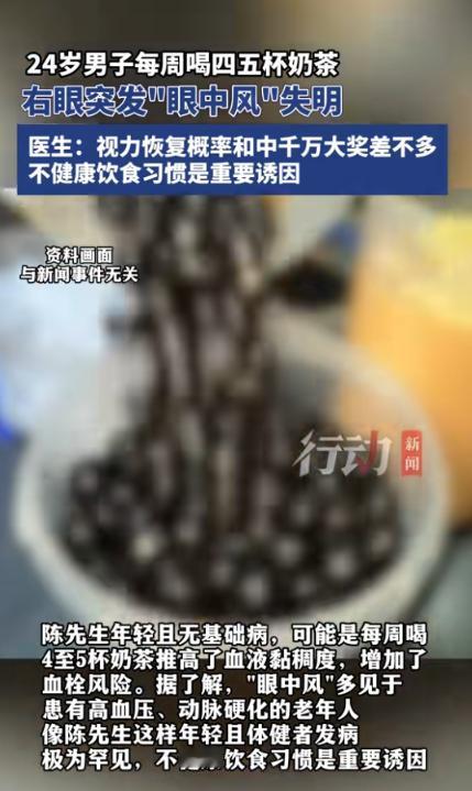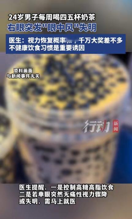 (信息来源:行动新闻《24岁男子每周喝四五杯奶茶,右眼突发“眼中风“失明,医生:视力恢复概率和中千万大奖差不多,不健康饮食习惯是重要诱因》)