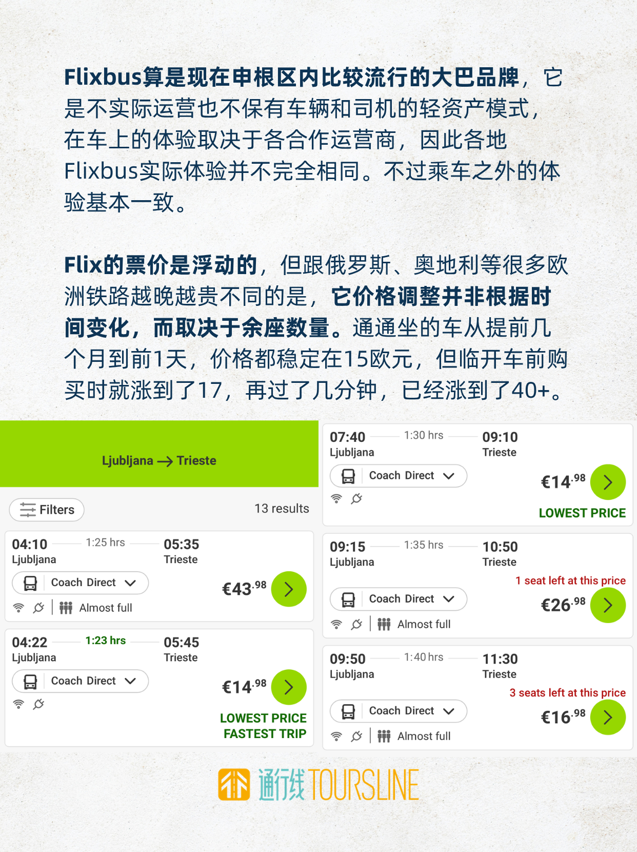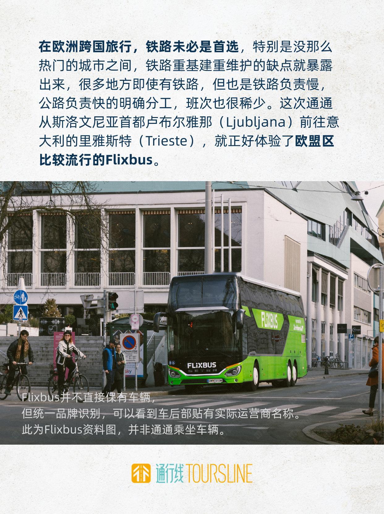通通在路上【坐绿皮大巴跨国,欧洲Flixbus乘车记】在欧洲跨国旅行,铁路未必是首选,特别是没那么热门的城市之间,铁路重基建重维护的缺点就暴露出来,很多地方即使有铁路,但也是铁路负责慢,公路负责快的明确分工,班次也很稀少。这次通通从斯洛文尼亚首都卢布尔雅那(Ljubljana)前往意大利的里雅斯特(Trieste),就正好体验了欧盟区比较流行的Flixbus。