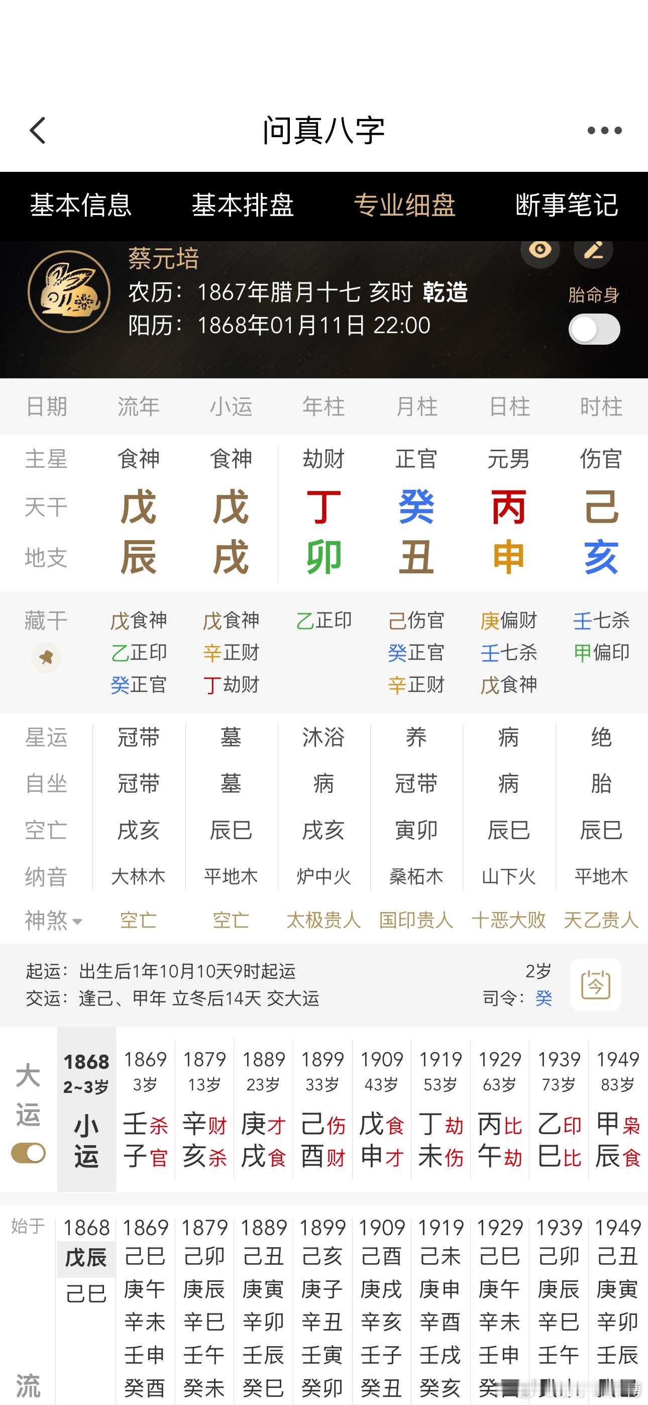 今天碰到一个同行说他参观蔡元培故居看到他的八字排起来后看不出他这八字好在哪里!首先来说如依传统财官来看他确实不算是个好命!他一生致力于教育事业,不蓄私产。后面晚年贫病交加,逝后连买口棺材的钱都没有!他这个命文笔好,他八字丙申日自坐文昌贵人,年支卯木正印。哪个同行说他伤官见官,但他不知道聪明莫过于伤官,伶俐莫过于七杀!月上伤官伤兄弟,他五兄弟有两个早夭,时上伤官伤子女,他和大房生的长子早夭!如此一看他这八字不就可以解释得清了!