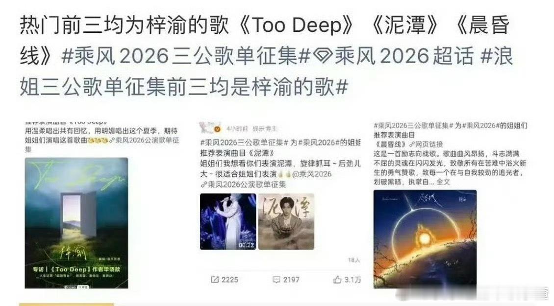 浪姐三公歌单征集活动前三都是梓渝的歌,然后节目组紧急修改了规则。
