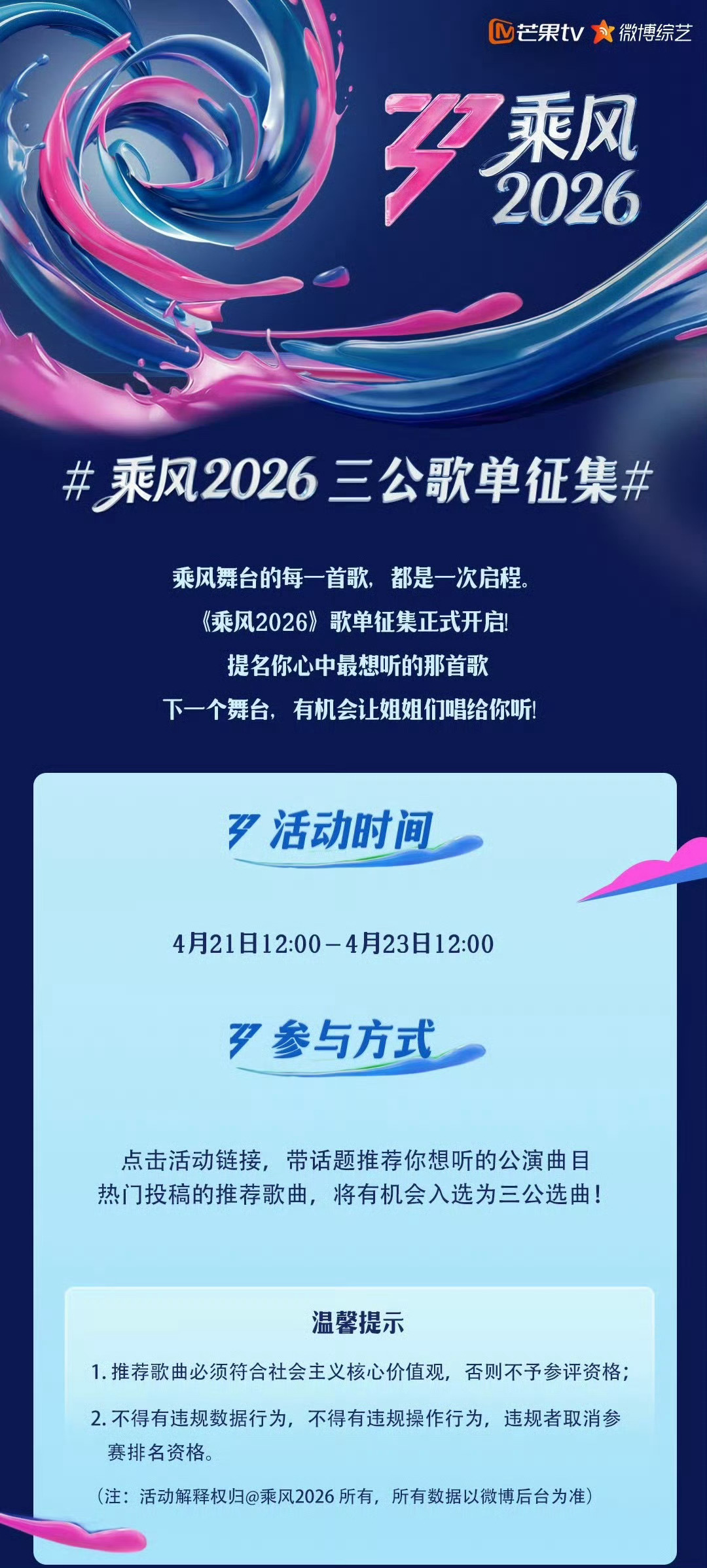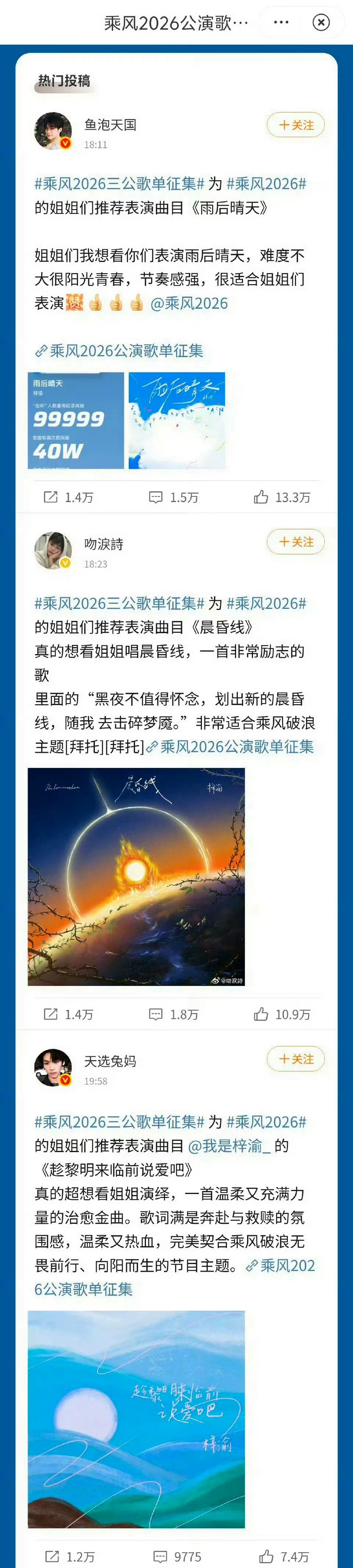 浪姐三公歌单征集活动因梓渝改规则浪姐三公歌单征集活动梓渝的三首歌曲《雨后晴天》、《趁黎明来临前说爱吧》、《晨昏线》包揽热门前三节目组紧急更改规则,从热门前三改成了全部热门都有机会被选中…笑发财了,梓渝粉丝过于强大,这是吓着节目组了吗❓