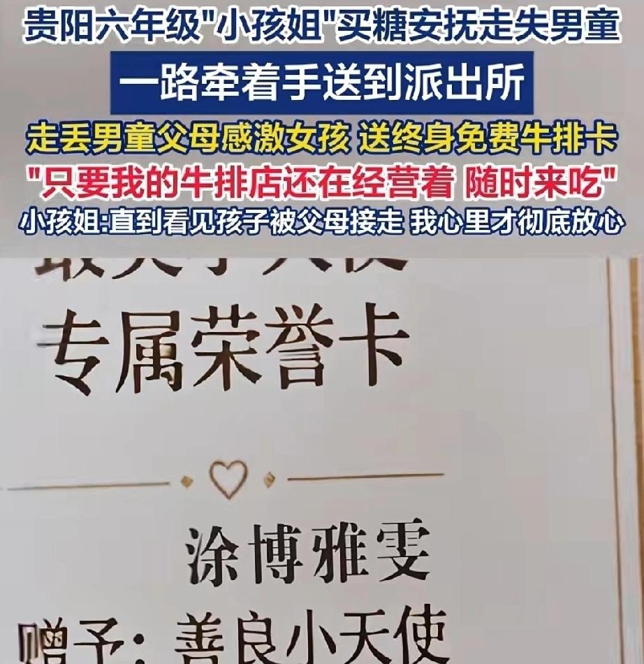 4月18日晚,贵州贵阳。六年级女生涂博雅雯路过观山湖区世纪城夜市,见到一名3岁的男童,在路上哭泣。善良的小姑娘前去问男童,你爸妈呢?男童答,不知道,问他父母的电话号码也不知道。小姑娘安抚他,别哭了,姐姐带你去找。