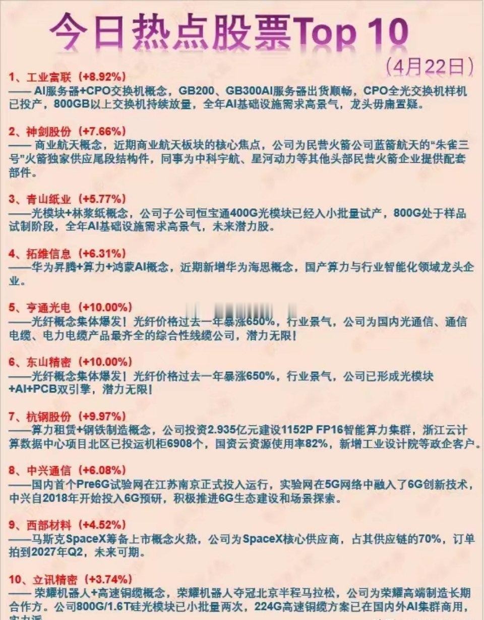 4月22日盘后热点股排行榜🏅🏅报告团长!一营营长张大彪有事禀报!1、工业富联(+8.92%)—— AI服务器+CPO交换机概念,GB200、GB300AI服务器出货顺畅,CPO全光交换机样机已投产,800GB以上交换机持续放量,全年AI基础设施需求高景气,龙头毋庸置疑。2、神剑股份(+7.66%)—— 商业航天概念,近期商业航天板块的核心焦点,公司为民营火箭公司蓝箭航天的“朱雀三号”火箭独家供应尾段结构件,同时为中科宇航、星河动力等其他头部民营火箭企业提供配套部件。3、青山纸业(+5.77%)——光模块+林浆纸概念,公司子公司恒宝通400G光模块已小批量试产,800G处于样品试制阶段,全年AI基础设施需求高景气,未来潜力股。4、拓维信息(+6.31%)——华为昇腾+算力+鸿蒙AI概念,近期新增华为海思概念,国产算力与行业智能化领域龙头企业。5、亨通光电(+10.00%)——光纤概念集体爆发!光纤价格过去一年暴涨650%,行业景气,公司为国内光通信、通信电缆、电力电缆产品最齐全的综合性线缆公司,潜力无限!6、东山精密(+10.00%)——光纤概念集体爆发!光纤价格过去一年暴涨650%,行业景气,公司已形成光模块+AI+PCB双引擎,潜力无限!7、杭钢股份(+9.97%)——算力租赁+钢铁制造概念,公司投资2.935亿元建设1152P FP16智能算力集群,浙江云计算数据中心项目北区已投运机柜6908个,国资云资源使用率82%,新增工业设计院等政企客户。8、中兴通信(+6.08%)——国内首个Pre6G试验网在江苏南京正式投入运行,实验网在5G网络中融入了6G创新技术,中兴自2018年开始投入6G预研,积极推进6G生态建设和场景探索。9、西部材料(+4.52%)——马斯克SpaceX筹备上市概念火热,公司为SpaceX核心供应商,占其供应链的70%,订单拍到2027年Q2,未来可期。10、立讯精密(+3.74%)—— 荣耀机器人+高速铜缆概念,荣耀机器人夺冠北京半程马拉松,公司为荣耀高端制造长期合作方。公司800G/1.6T硅光模块已小批量两次,224G高速铜缆方案已在国内外AI集群商用,实力派。股市记录分享商业航天低价股SpaceX的未来发展前景怎样荣耀机器人夺冠只是“应试”高手吗飞荣达:相变材料等用于光模块现在的股市你怎么看