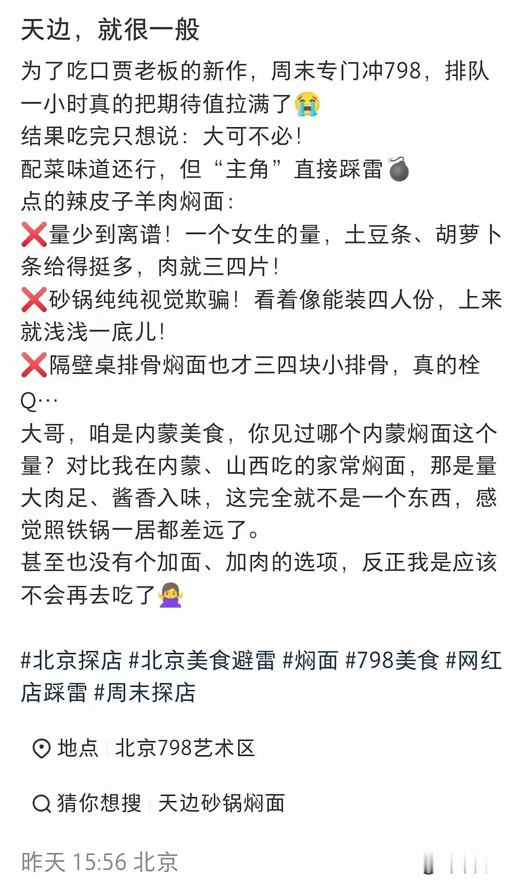 唉,又像妈妈西贝那性价比不高的基因死硬遗传。消费者还是喜欢吃预制贾(假)的天价焖面,吃预制贾(假)Xi贝还没吃够。