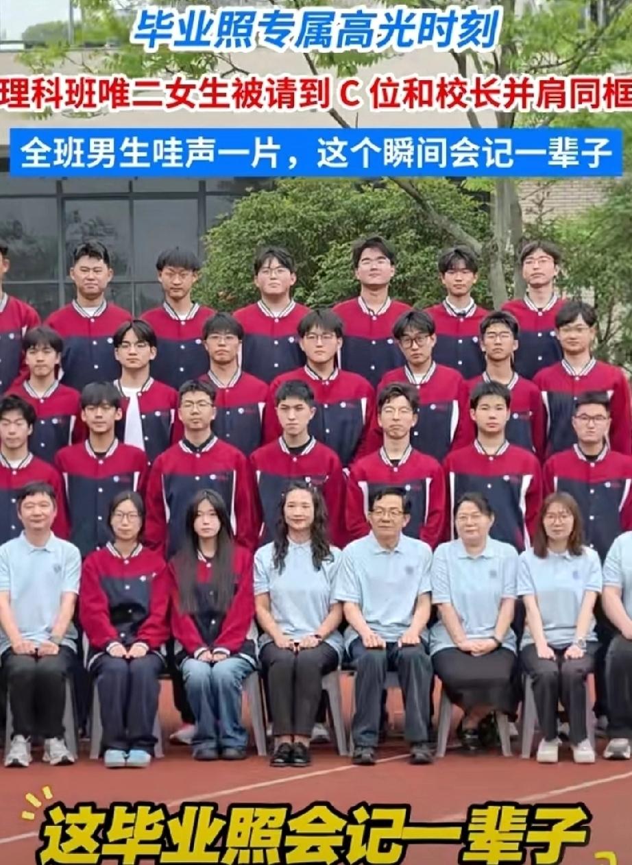 浙江绍兴。高三理科班在拍毕业照时,出现了有趣的一幕。按照惯例,校领导和老师坐在前排,学生站在后排。可是副校长一来,打破惯例,邀请两位女生坐在前排C位,和校长并肩齐坐。成为了两个女生的高光时刻。班上其他毕业生“哇哦”声一片,投上羡慕的眼光。
